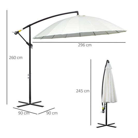 3(m) Cantilever Shanghai Parasol Garden Hanging Banana Sun Umbrella with Crank Handle, 18 Sturdy Ribs and Cross Base, Off-White