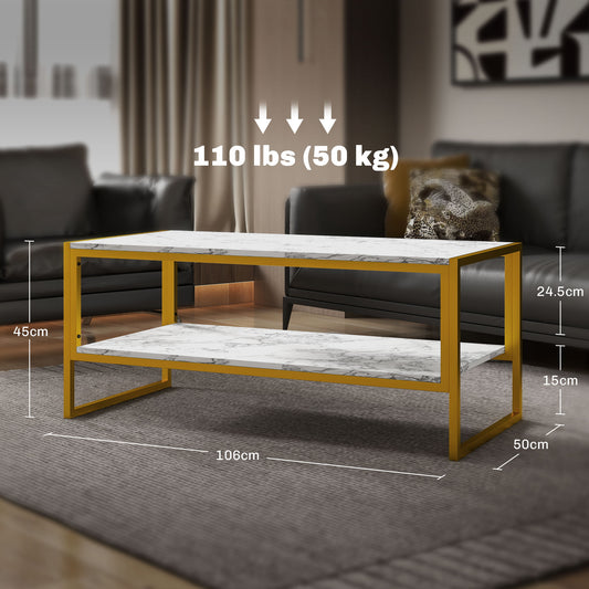 Two-Tier Coffee Table with Marble Effect Shelf and Metal Frame White