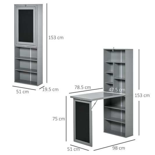 Fold-out Convertible Writing Desk Wall Mount Cabinet with Blackboard and Side Shelf Multi-Function Home Office Workstation, Grey