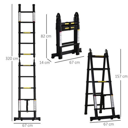 3.2m Extendable Aluminium Ladder, Portable 10 Step Ladder, Black