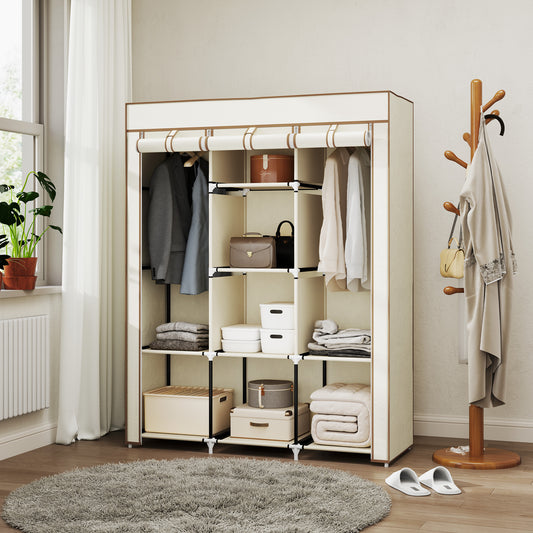 Fabric Portable Wardrobe with 8 Shelves 2 Hanging Rails, Cream White