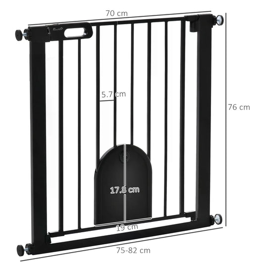 Dog Gate with Cat Flap Pet Safety Gate Barrier, Stair Pressure Fit, Auto Close, Double Locking, for Doorways, Hallways, 75-82 cm Black