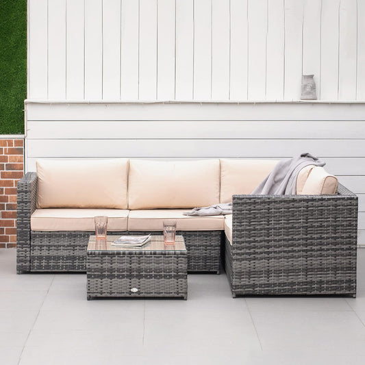 4-Seater Garden Rattan Furniture Set, Outdoor Sectional Conversation PE Rattan Set, with Cushions Pillows and Glass Table, Mixed Grey