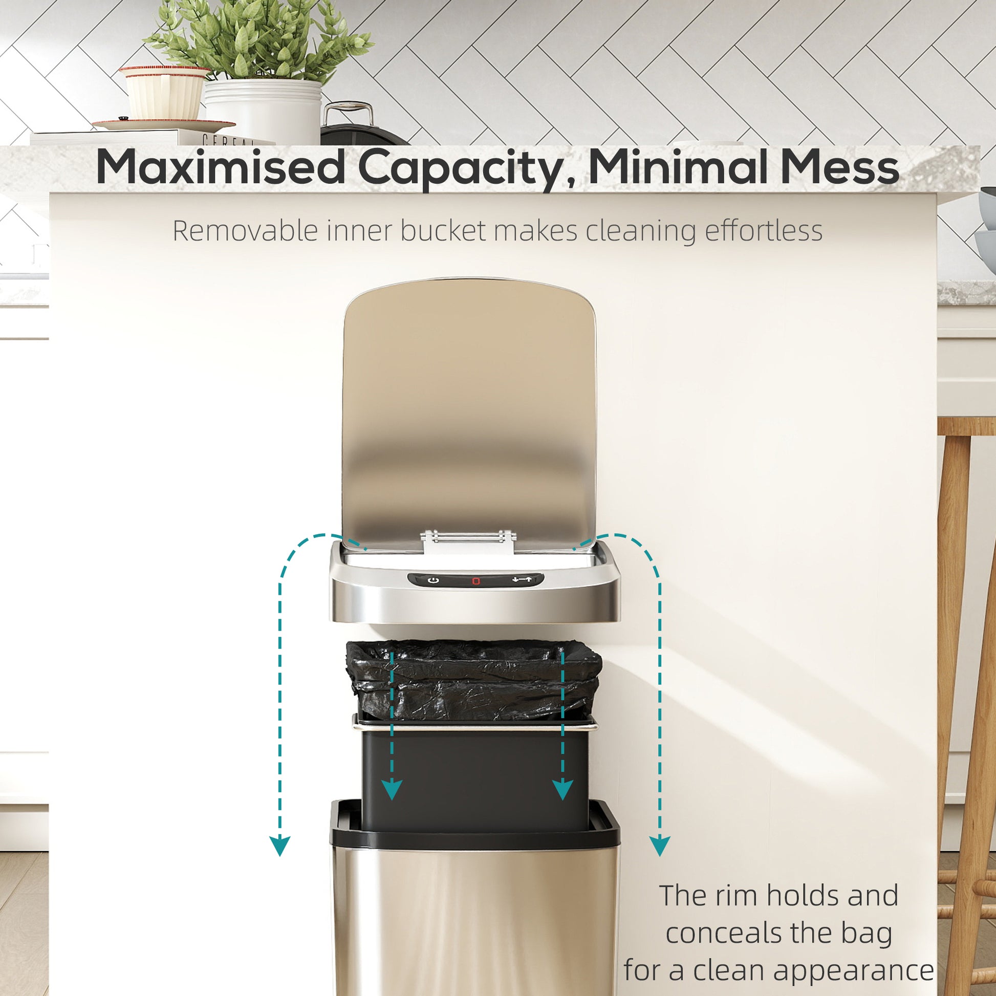 - Bag-retainer ring keeps liners hidden for a tidy appearance