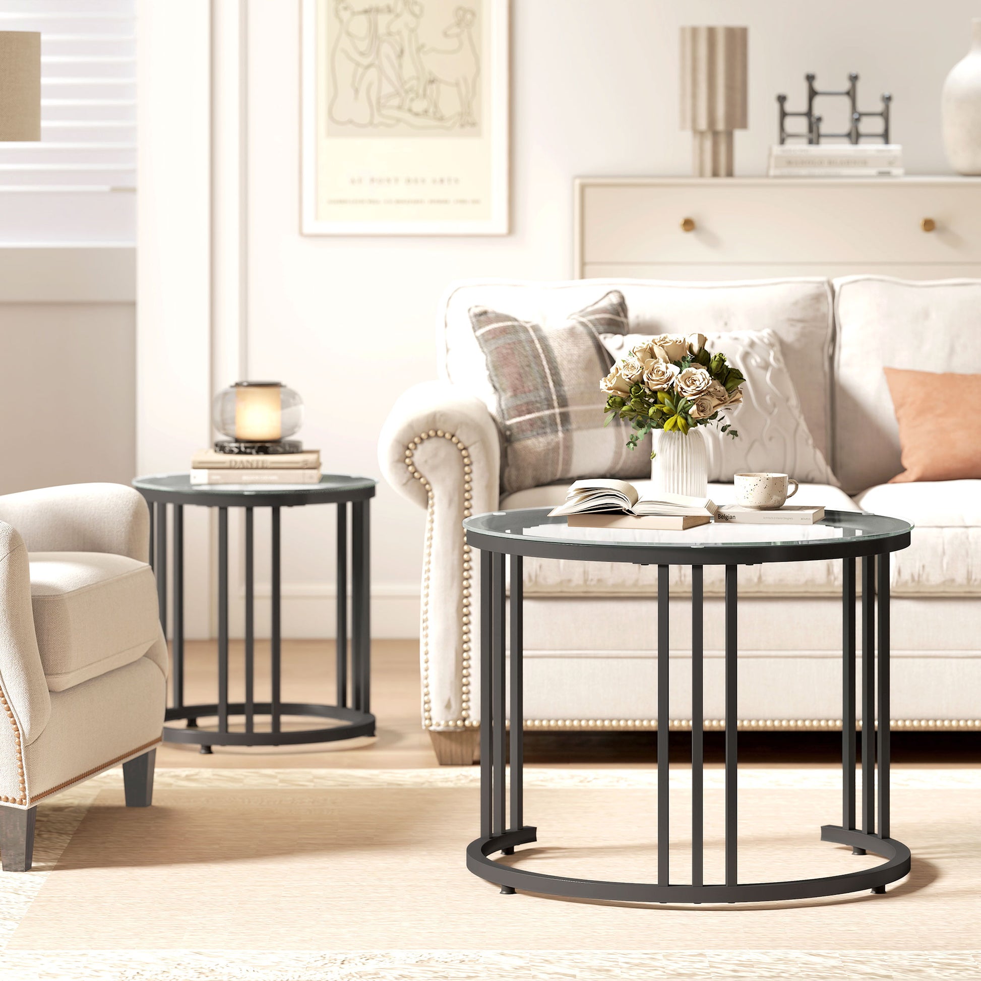 2 Pieces Round Nesting Coffee Tables with Tempered Glass Top, Black