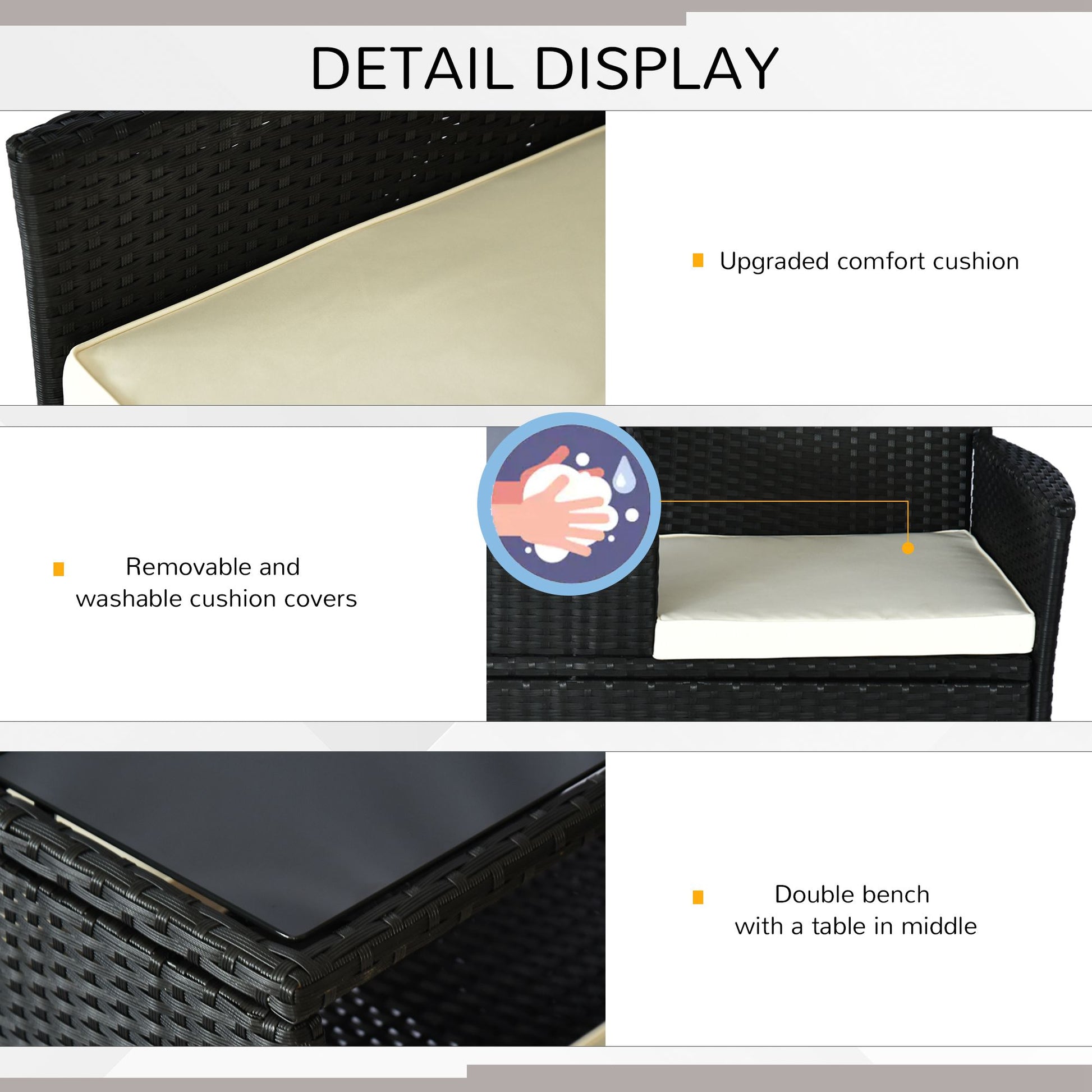 - Includes 2 x attached chairs, 1 x built-in glass coffee table and 2 x cream seat cushions