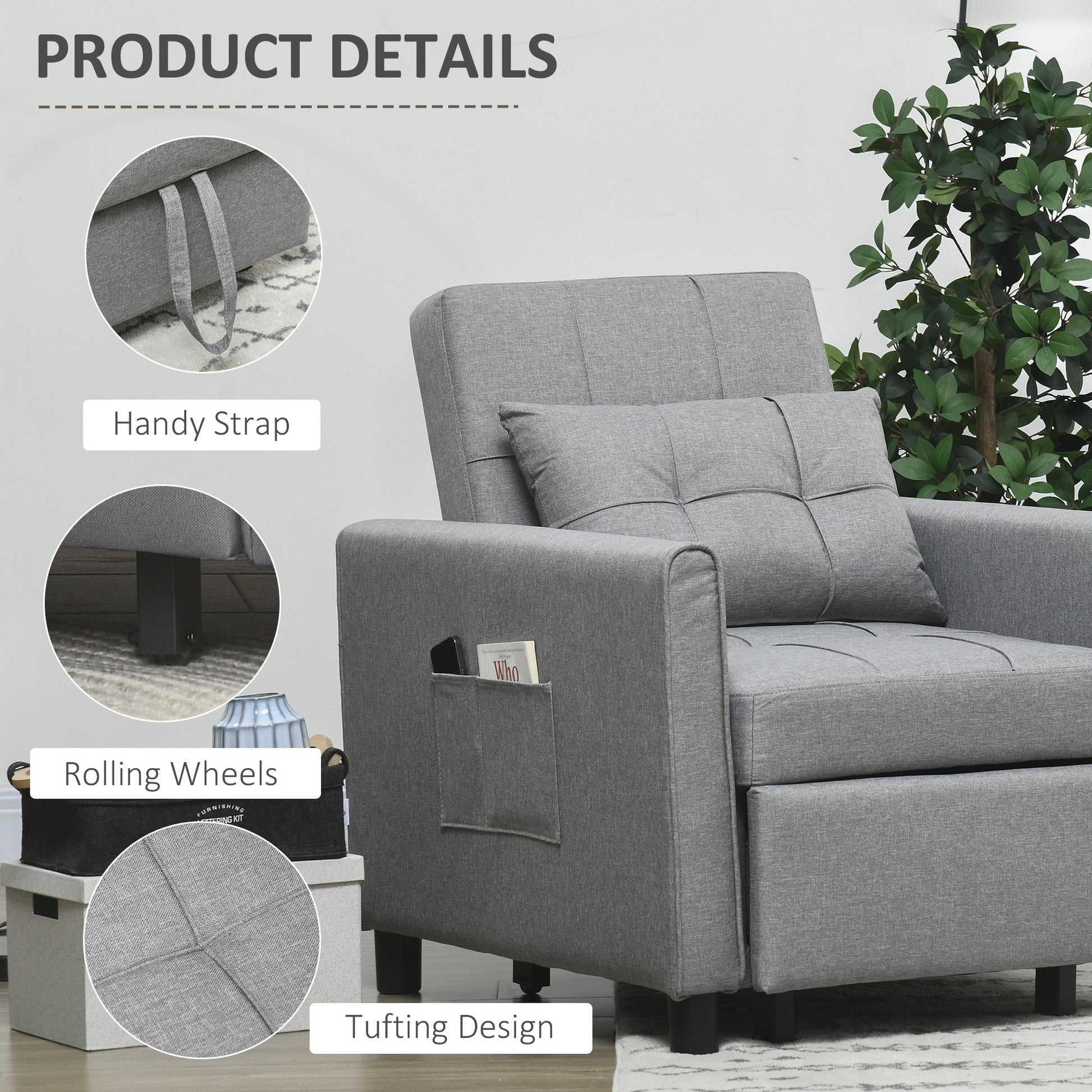 3-In-1 Convertible Chair Bed, Pull Out Sleeper Chair, Fold Out Bed with Adjustable Backrest, Side Pockets, Grey