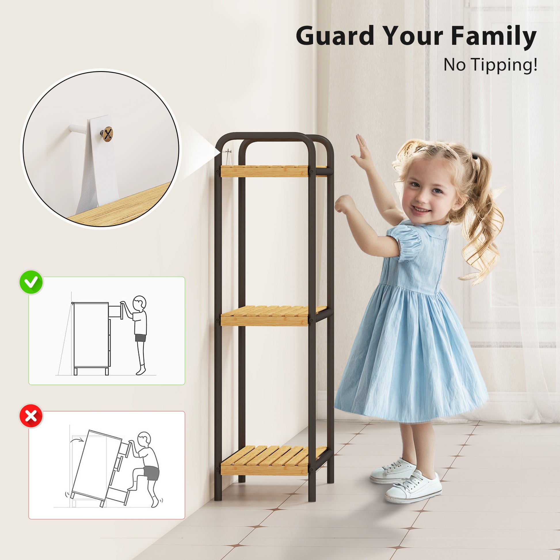 Transform your bathroom into a haven of safety and style with the freestanding bathroom shelf unit. Designed with anti-tip devices and a robust steel frame, it ensures peace of mind for families with little ones. Crafted from bamboo and steel with fresh varnish, it blends durability with natural aesthetics. Its three-tier slatted shelves offer lots of space to keep essentials organised and elevate your living experience.Specifications