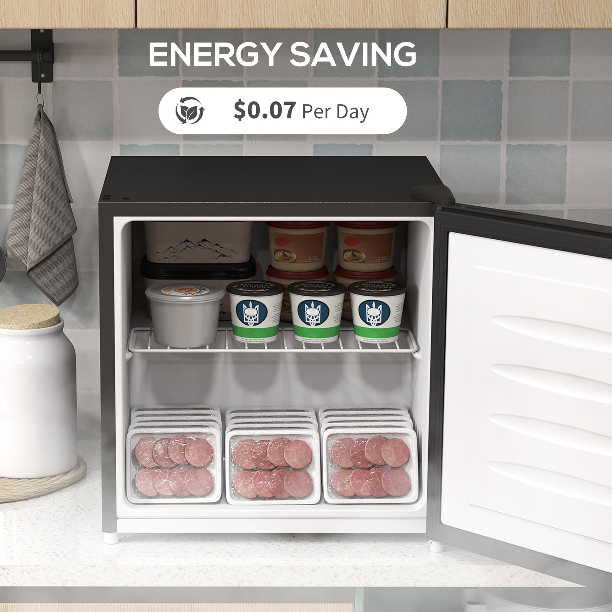Fantastic freezing, even in the smallest of spaces with this 35L freezer. Its capacity offers enough room for frozen meals, snacks and other essentials. The 48.8cm x 47cm size means this small freezer is great for countertops - suitable for small spaces, whether that's shared or individual use. Adjustable the temperature between -24℃ to -14℃: pick a level best for your needs. It comes with a reversible door: let it open left or right.Specifications