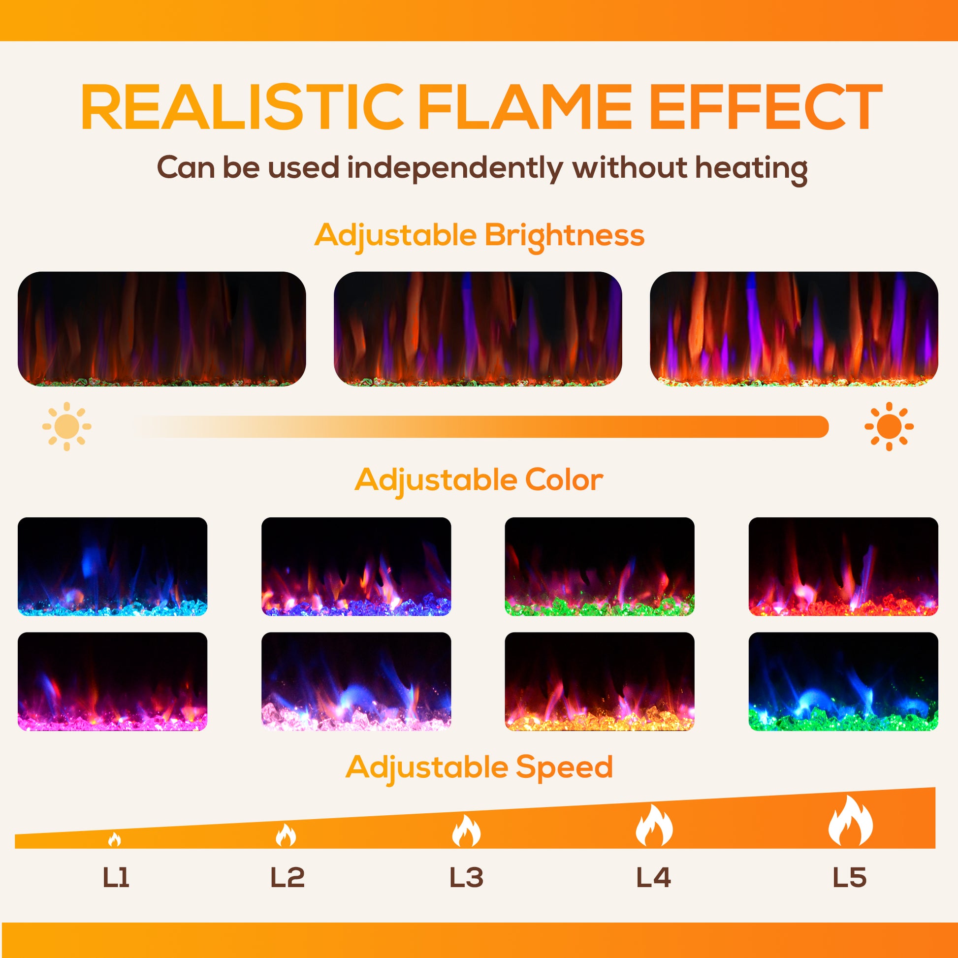 Tired of a cold, lifeless room? A plain wall makes your home feel empty. The electric fireplace blends into your wall or hangs elegantly, offering warmth without bulk. Choose flame and crystal colours to match any mood, turning chilly evenings into inviting, memorable moments. Enjoy both modern style and comfort with this electric fireplace.Specifications