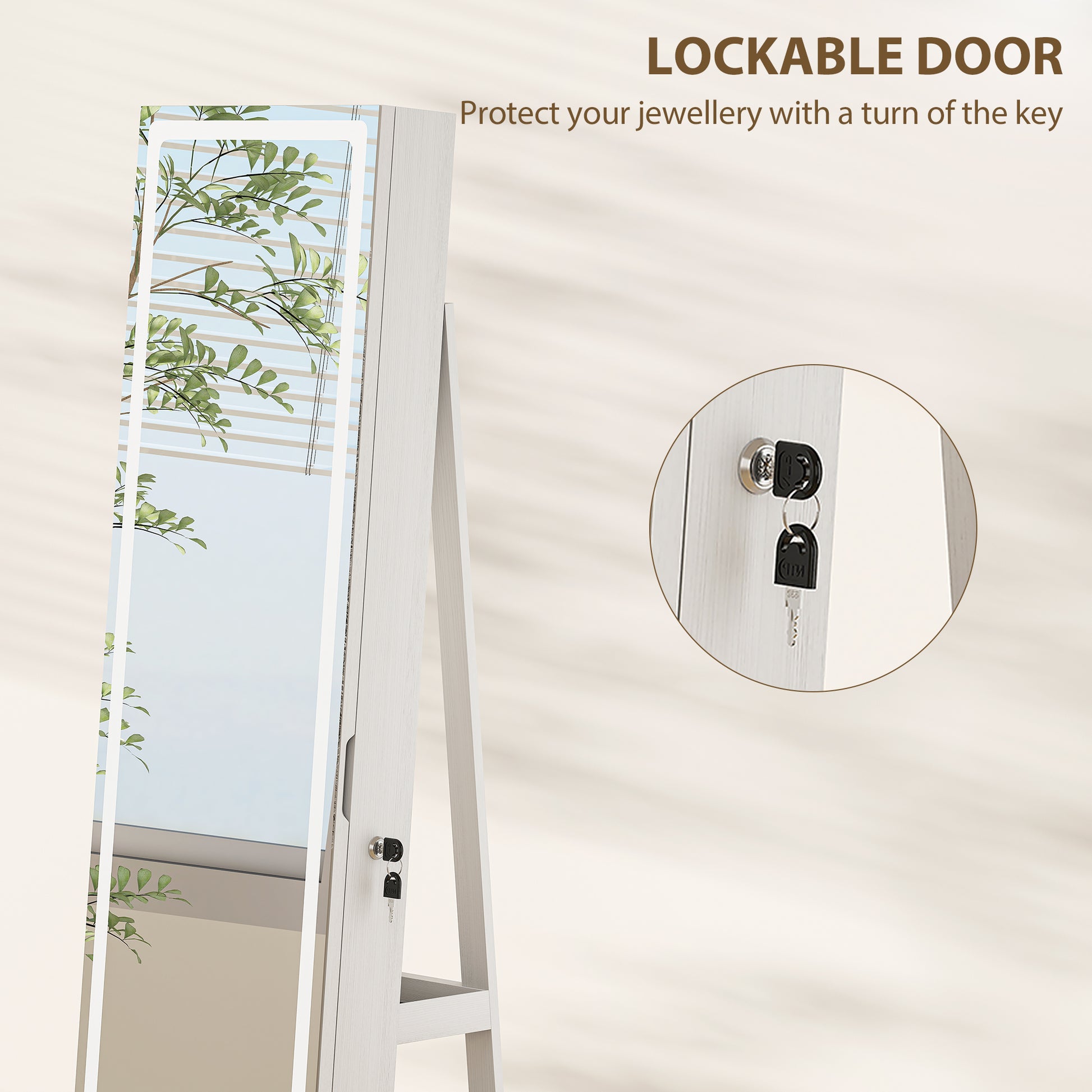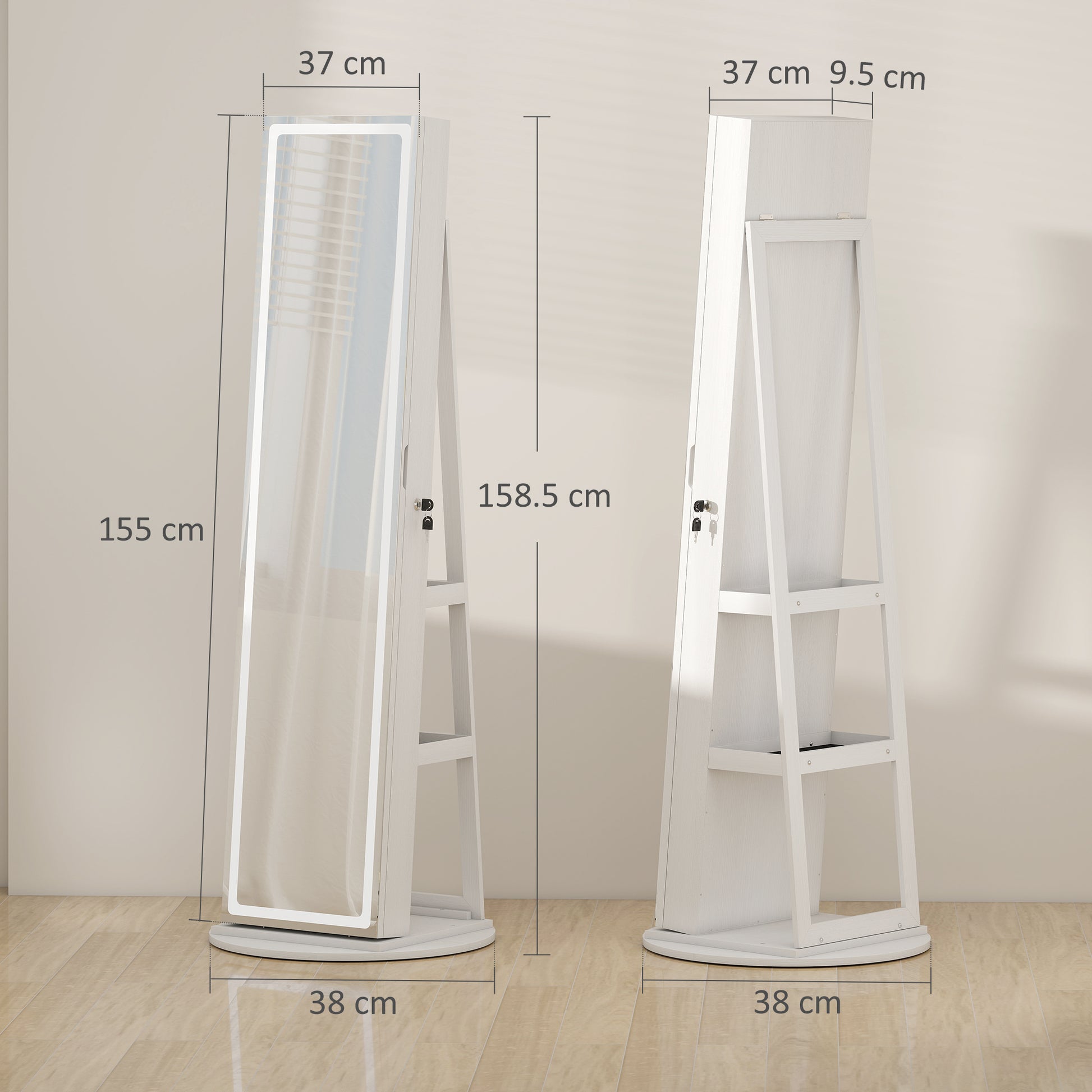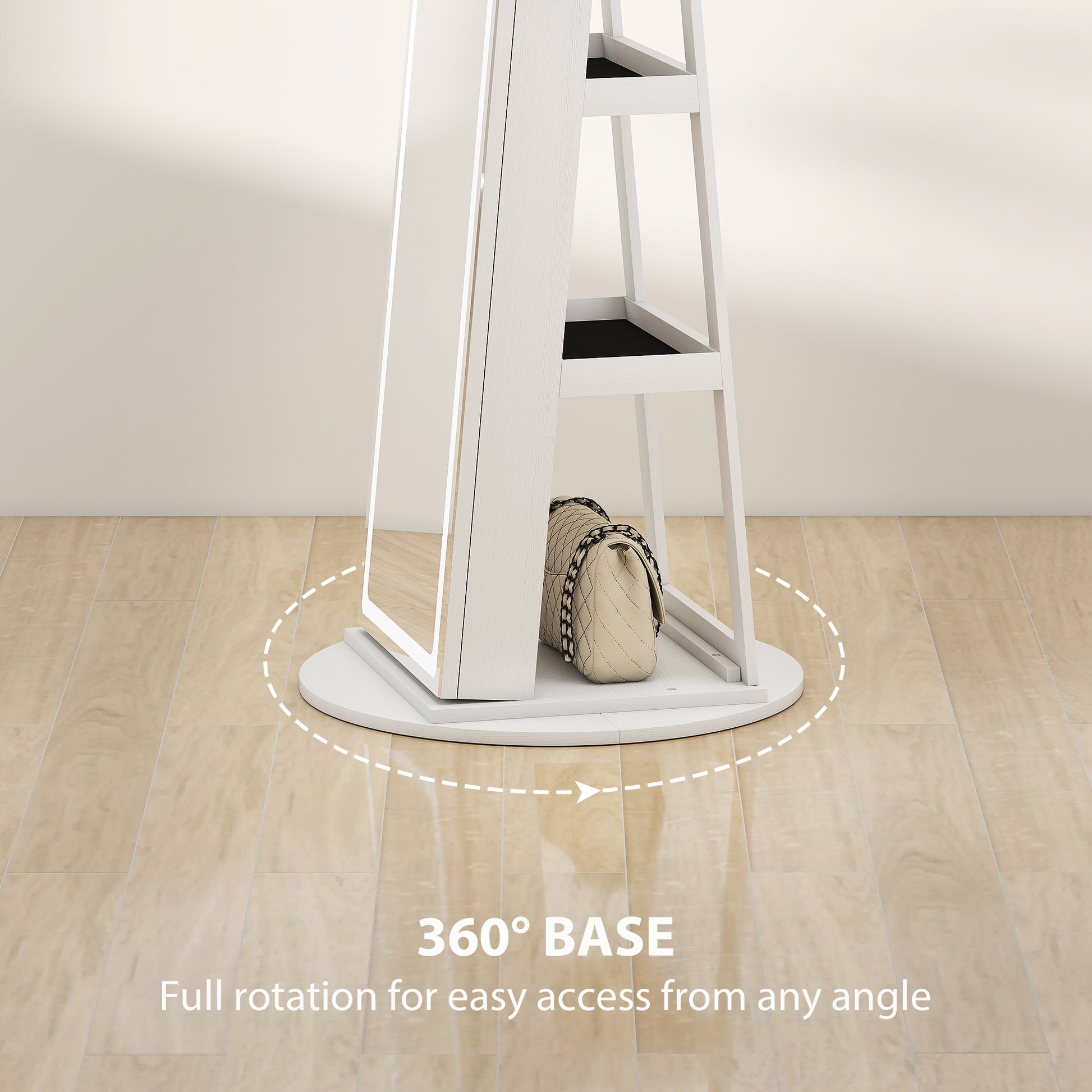 Rushed mornings and tangled jewellery can start your day off wrong. Imagine stepping up to the full length mirror with storage, where a 360° rotating mirror lets you refine your look from every angle. With generous storage and customizable LED lighting, this jewellery organiser transforms daily routines into moments of calm, style and effortless organization.Specifications