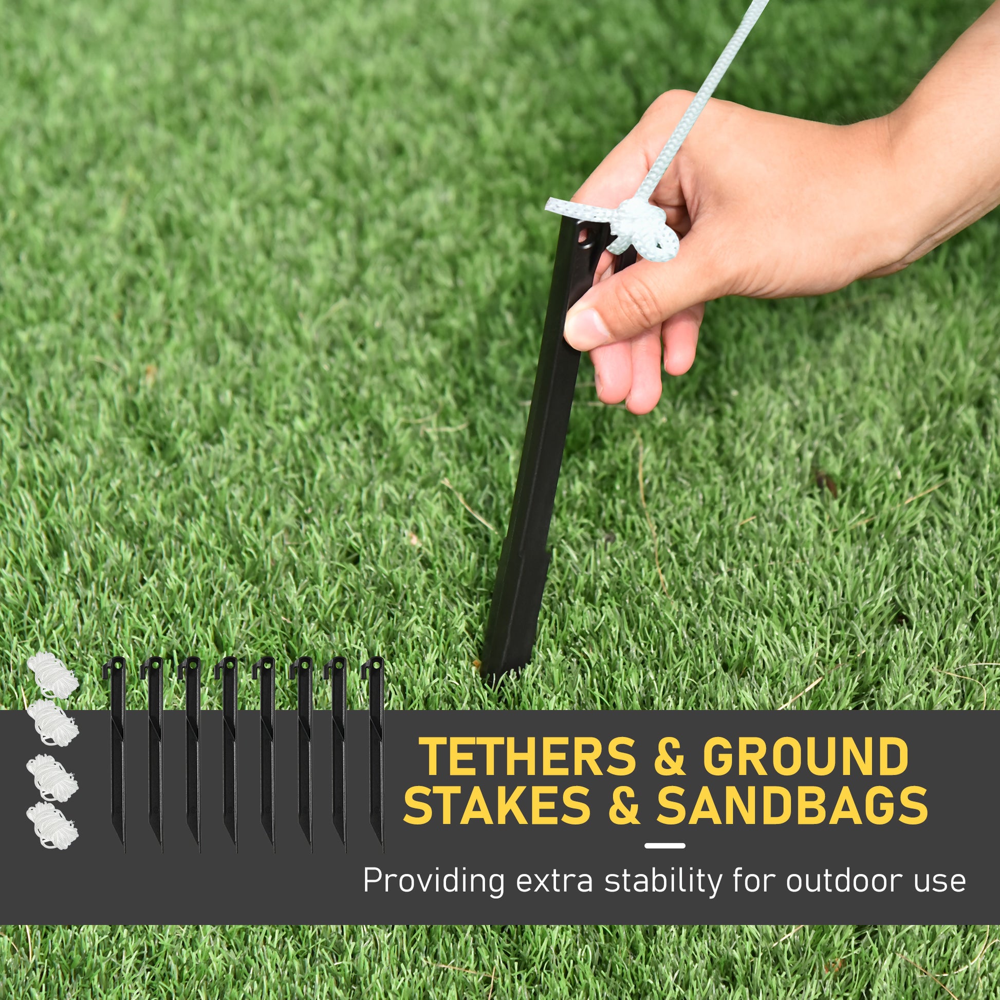 - Includes 8 x ground stakes, 4 x guy ropes and 2 x sandbags