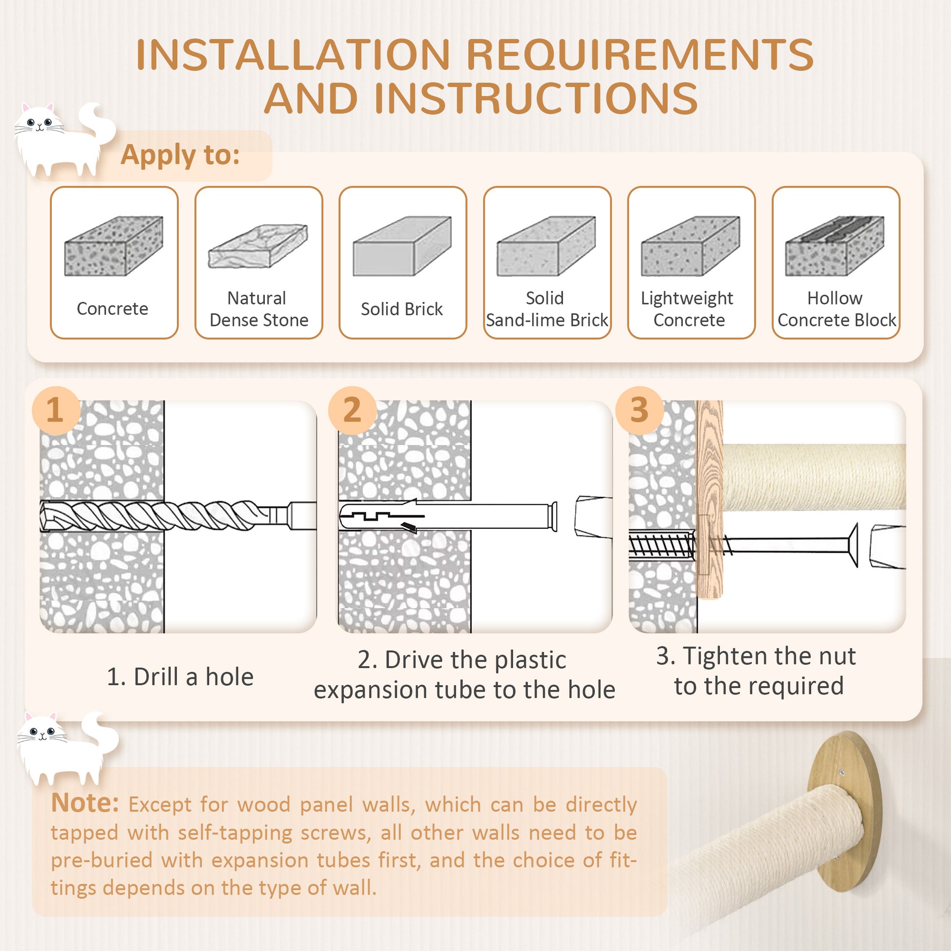 - Note: All walls need to be pre-filled with expansion tubes, except for plank walls, where self-tapping screws can be used directly on the wall