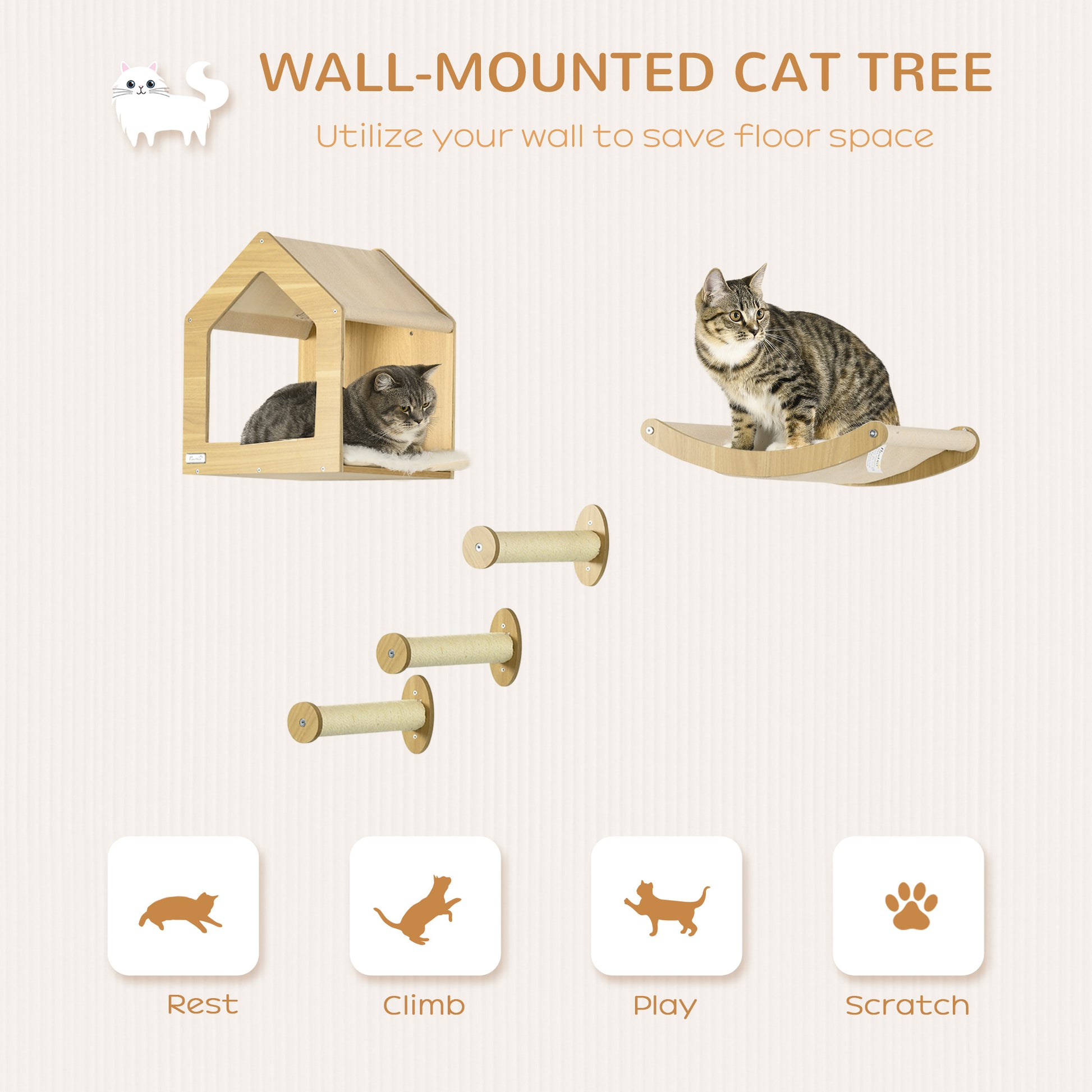 - Saving Your Furniture: It is common for cats to scratch to remove old claw material, mark their territory, and stretch, which are all natural instincts cats have. With scratching posts wrapped with durable natural sisal ropes, our cat wall furniture is perfect to sharpen their claws and save your furniture.