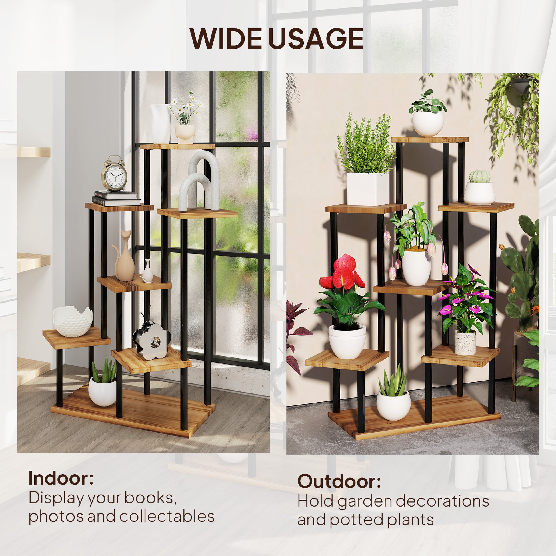 Transform any corner of your home with the Outsunny Plant Shelf, a chic blend of steel and fir wood. This tiered plant stand flaunts a unique staggered design, holding up to 10 pots, great for showcasing your indoor and outdoor greenery. It's not just for plantsuse it as a stylish corner plant stand to display your favourite decor, books and photos.