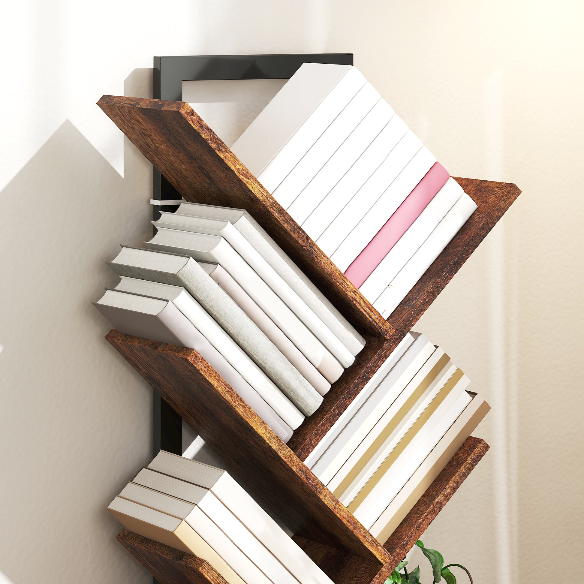 7-Tier Tree Bookshelf with Steel Frame for Living Room, Rustic Brown