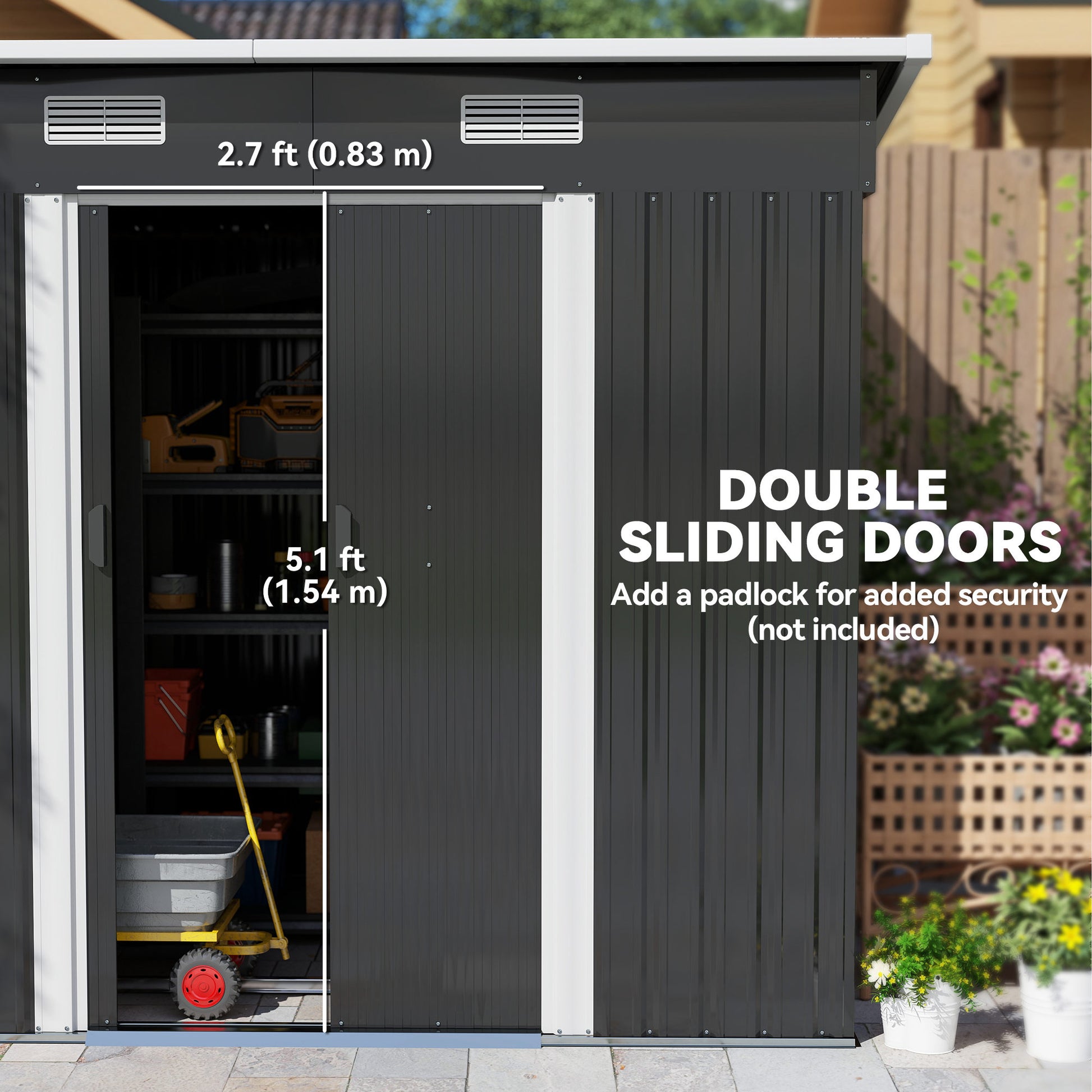 This outdoor shed is a safe and protective way for keeping tools, equipment and outerwear stored. It's also spacious enough as a bike storage shed too - great for the outdoor adventurers. Made from corrugated steel, it's strong, fitted with a sloped shed to prevent rainwater building up. Two front vents keep the inside as fresh as possible. A sliding door for easy access, shed comes complete with a foundation kit.Specifications