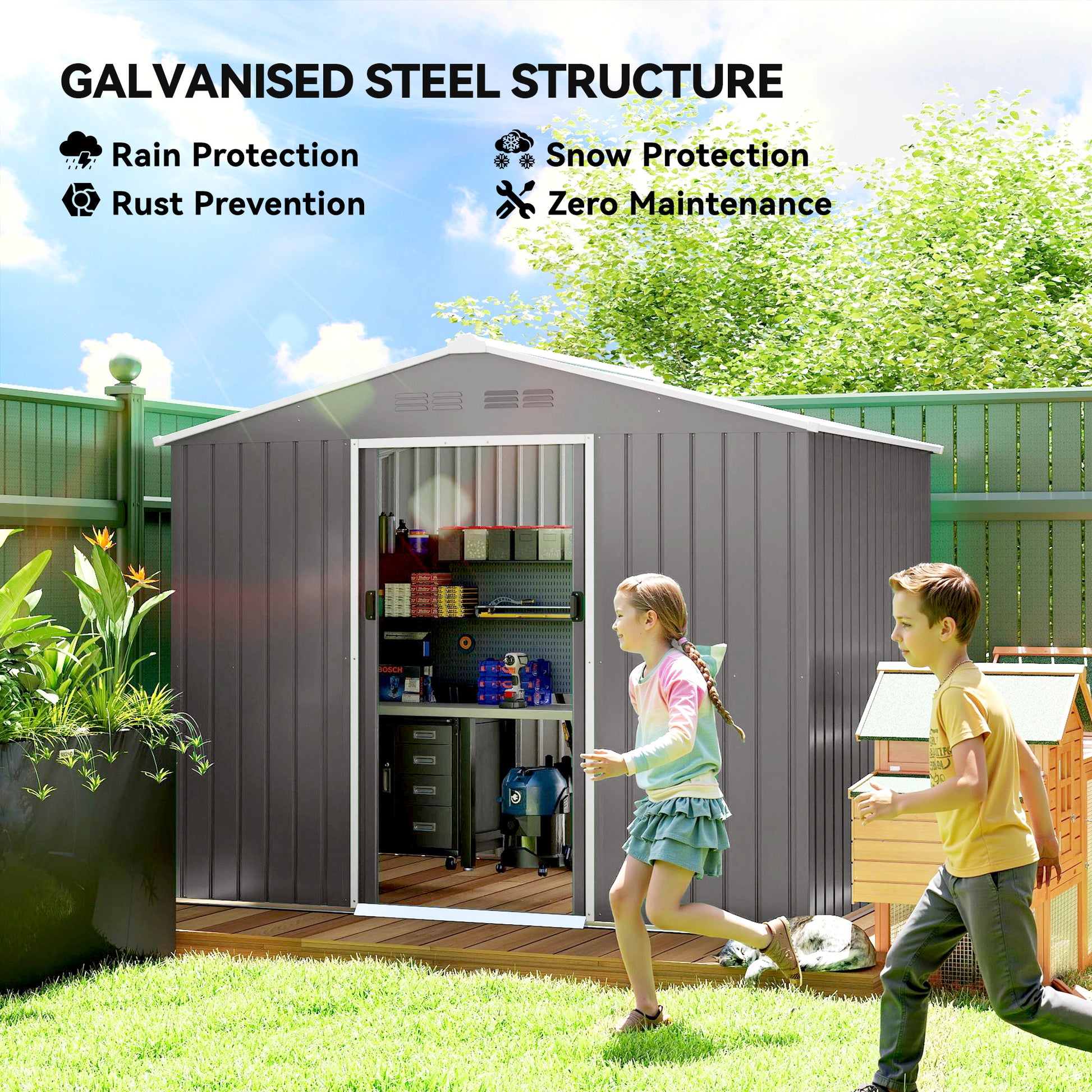 This tool shed is the top place to keep your tools, garden equipment and outerwear stored and protected. It's made from galvanised steel - a tough and solid shell, resistant to mild weather and rusting. The sloping roof helps prevent rain water from accumulating, so it doesn't seep through and damage inner items. Metal garden shed is complete with a double sliding door for easy access, plus four ventilation slots to keep inside aerated and fresh.Specifications