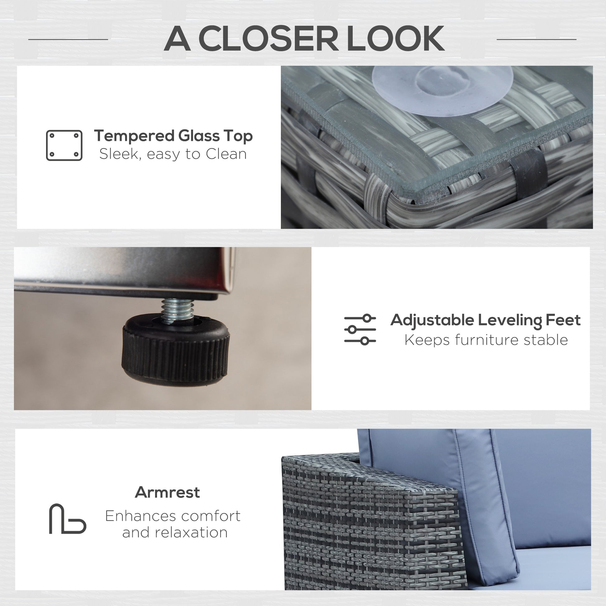 Make your garden stand out like never before with this beautiful outdoor corner sofa from Outsunny. Using aluminum for the base frame of the garden sofa to create a long-term and stable structure, each of the eight pieces included (two corner seats, four normal seats, a footstool, and table) are wrapped in mixed-grey rattan to ensure strength of the conservatory furniture, with a smooth finish that can be wiped clean easily. Padded seats and back cushions provide comfort.Specifications