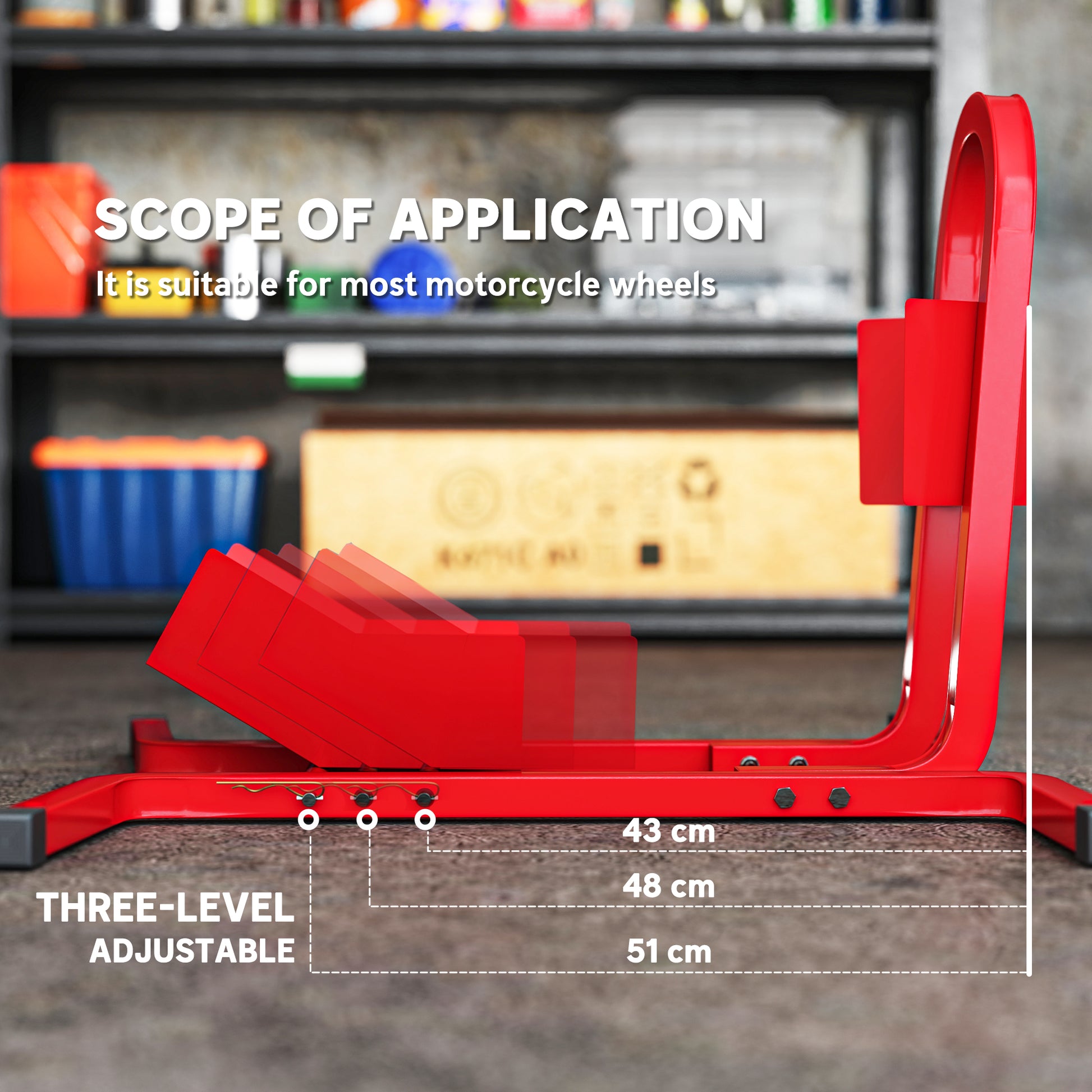 Let your motorbike stand proud and steady with this wheel chock from HOMCOM. Formed from metal with a powder coating for extra strength and protection, it features pre-drilled holes for you to fix to the floor or wherever you need it to be placed. It can be adjusted to three levels and is suitable for tyres between 17" and 21". It's finished with rubber caps on the ends to prevent the frame damaging your floor.Specifications
