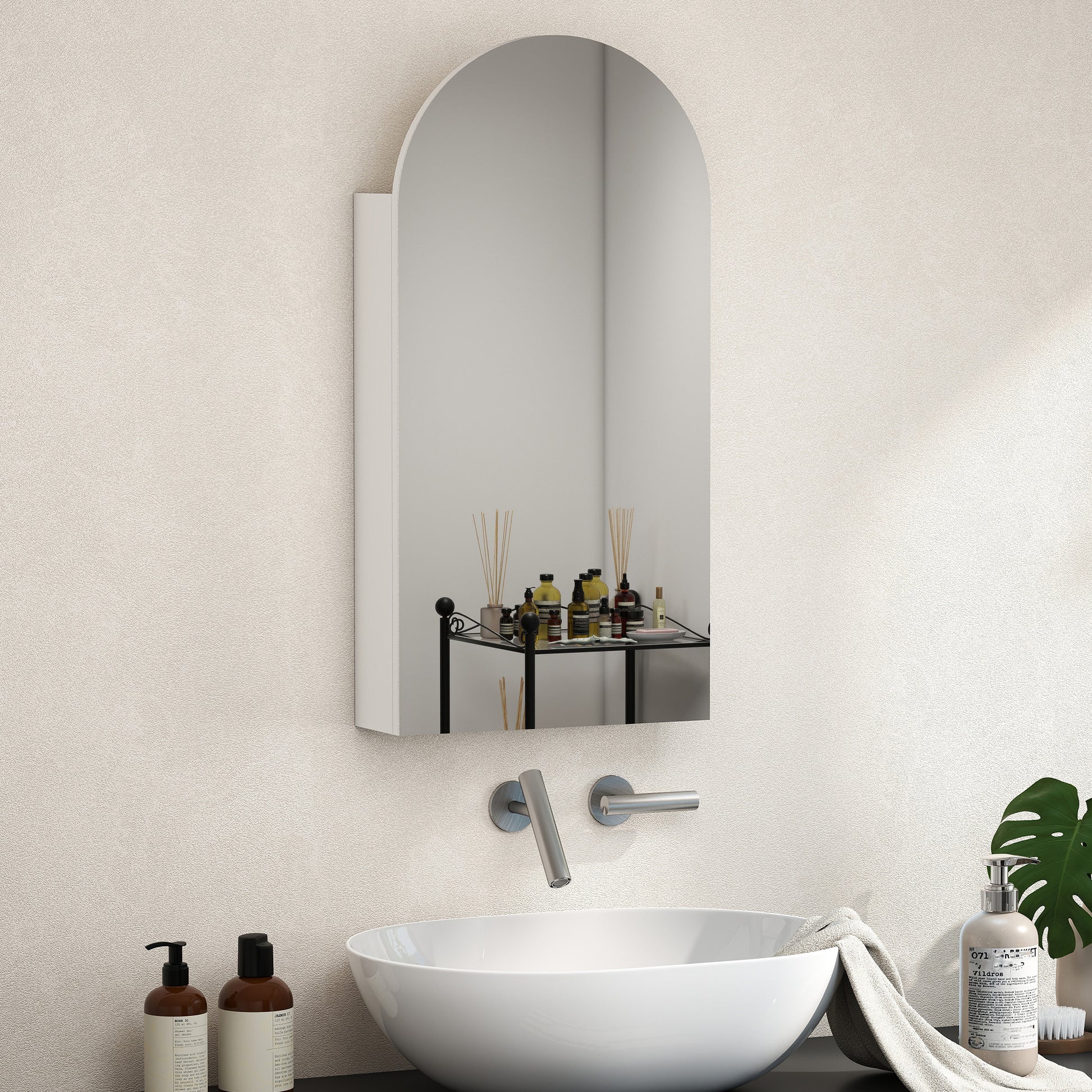 Transform your daily routine with the bathroom mirror cabinet. Struggling with cluttered counters? Its elegant arch-shaped, frameless design adds modern sophistication while three adjustable glass shelves offer tailored storage for toiletries and cosmetics. Great for compact spaces, this bathroom wall cabinet maximizes vertical setting. Elevate your bathroom's style and functionality effortlessly with this space-saving solution.Specifications