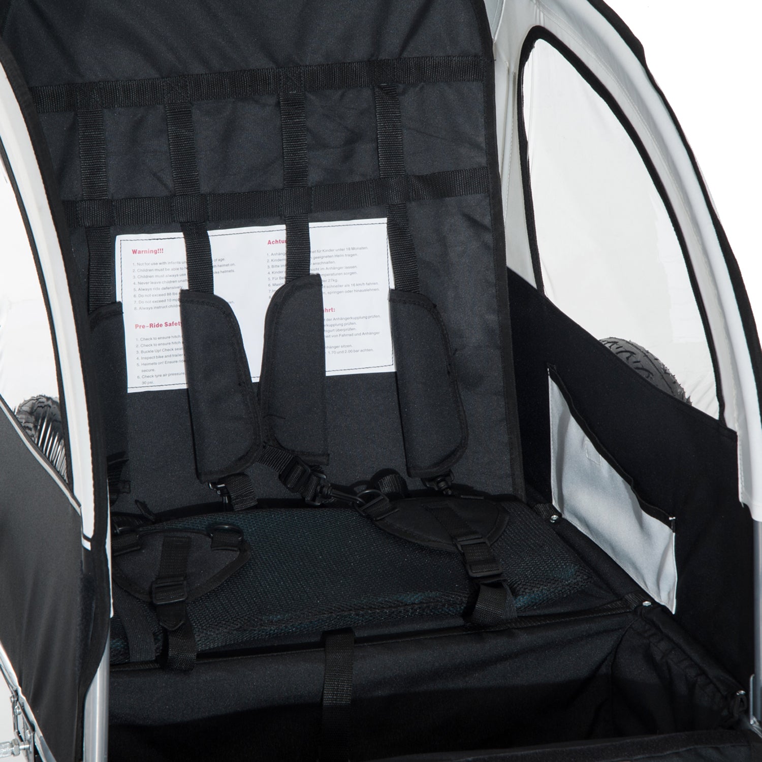 - Shock-absorbing wheels of the baby bike trailer offering more stable and enjoyable ride