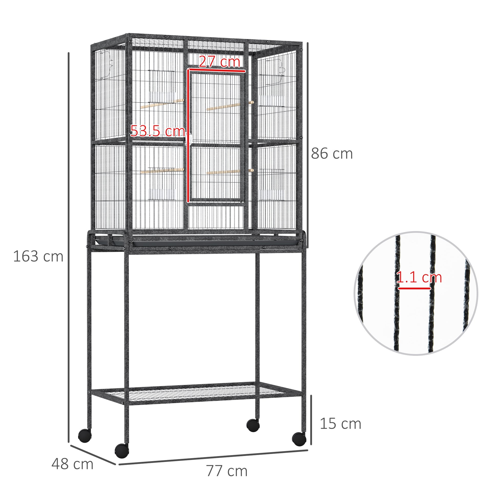 - Dimensions: 162.5H x 81L x 48Wcm. Bird cage: 86H x 76L x 46.5Wcm. Front door: 53.5H x 27Wcm. Feeding door: 13.5H x 8Wcm. Side door: 12.5H x 14Wcm. Bottom tray: 3H x 74L x 45.5Wcm. Wood perch: Φ1.2 x 48Lcm. Food container: 5H x 8L x 7.5Wcm. Bottom shelf: 15H x 81L x 48Wcm