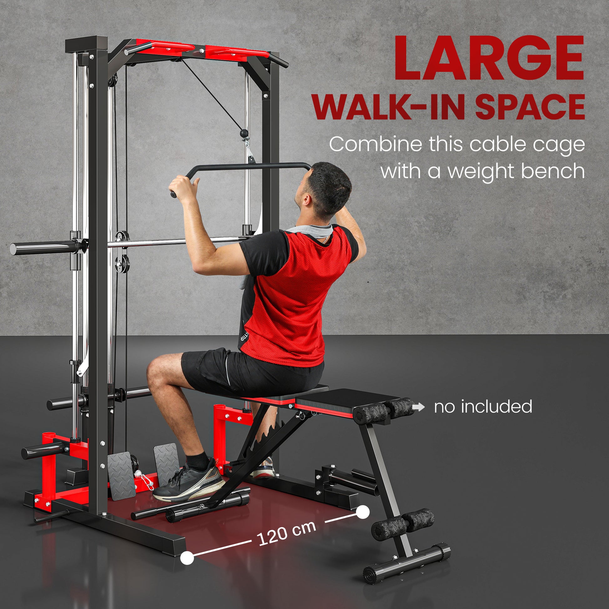 Unlock your fitness potential with the power rack with a pulley system! This versatile weight cage features a pull-up stand, barbell rack and a landmine for a full-body workout. Easily adjust the 8-level barbell rack to fit your height and challenge yourself with up to 50 kg on the lat pull-down and low-row bar. Great for any home workout enthusiast.Specifications