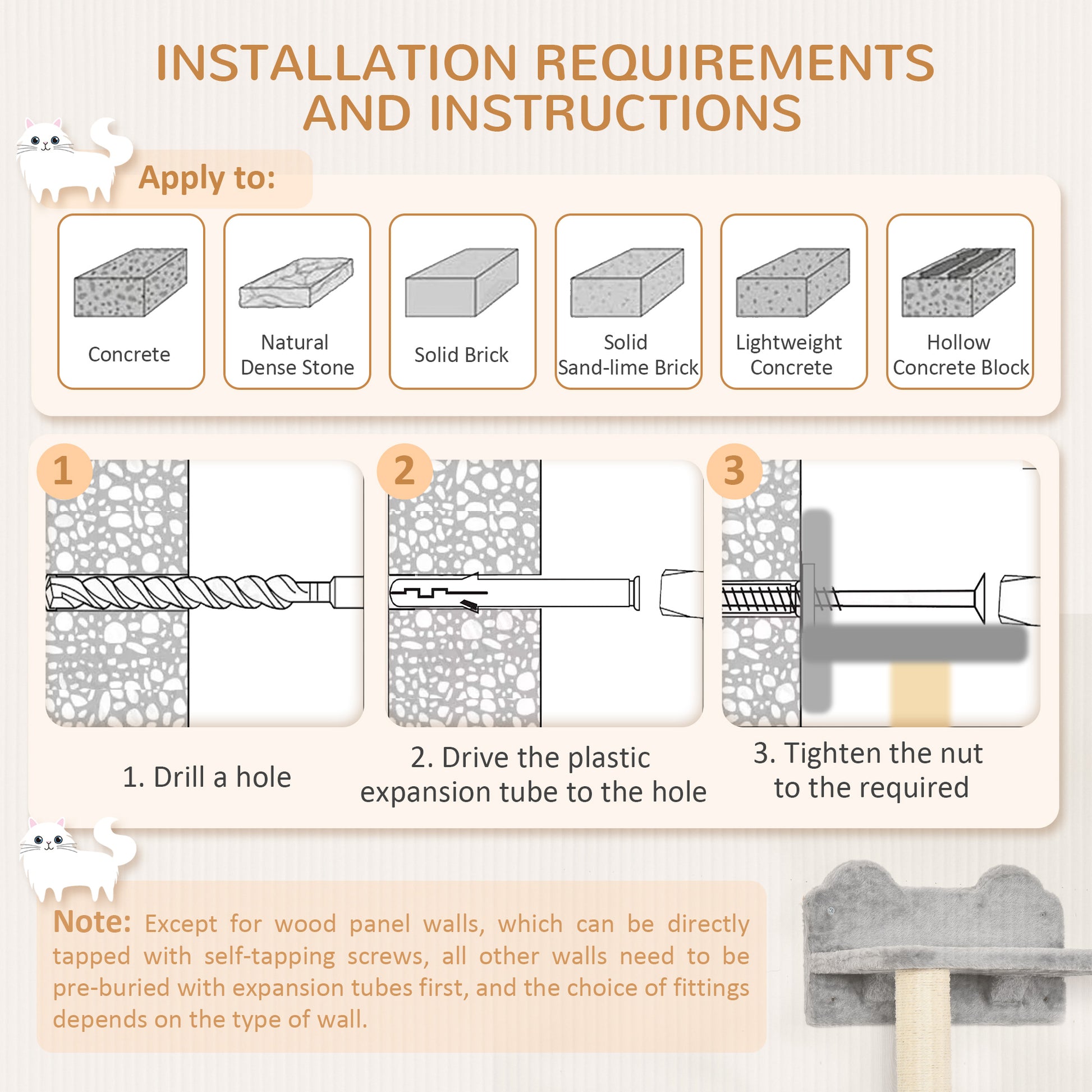 Transform limited space into a feline paradise, thanks to this PawHut cat shelf set. Designed for the wall, it's covered with soft plush and has a cosy cat house for comfort, whilst elevated platforms, scratching posts and steps keep them happy and active. It's a safe haven, where they can really experience joy and relaxation. Watch them revel in happiness, making their days that much better for this cat climbing wall.