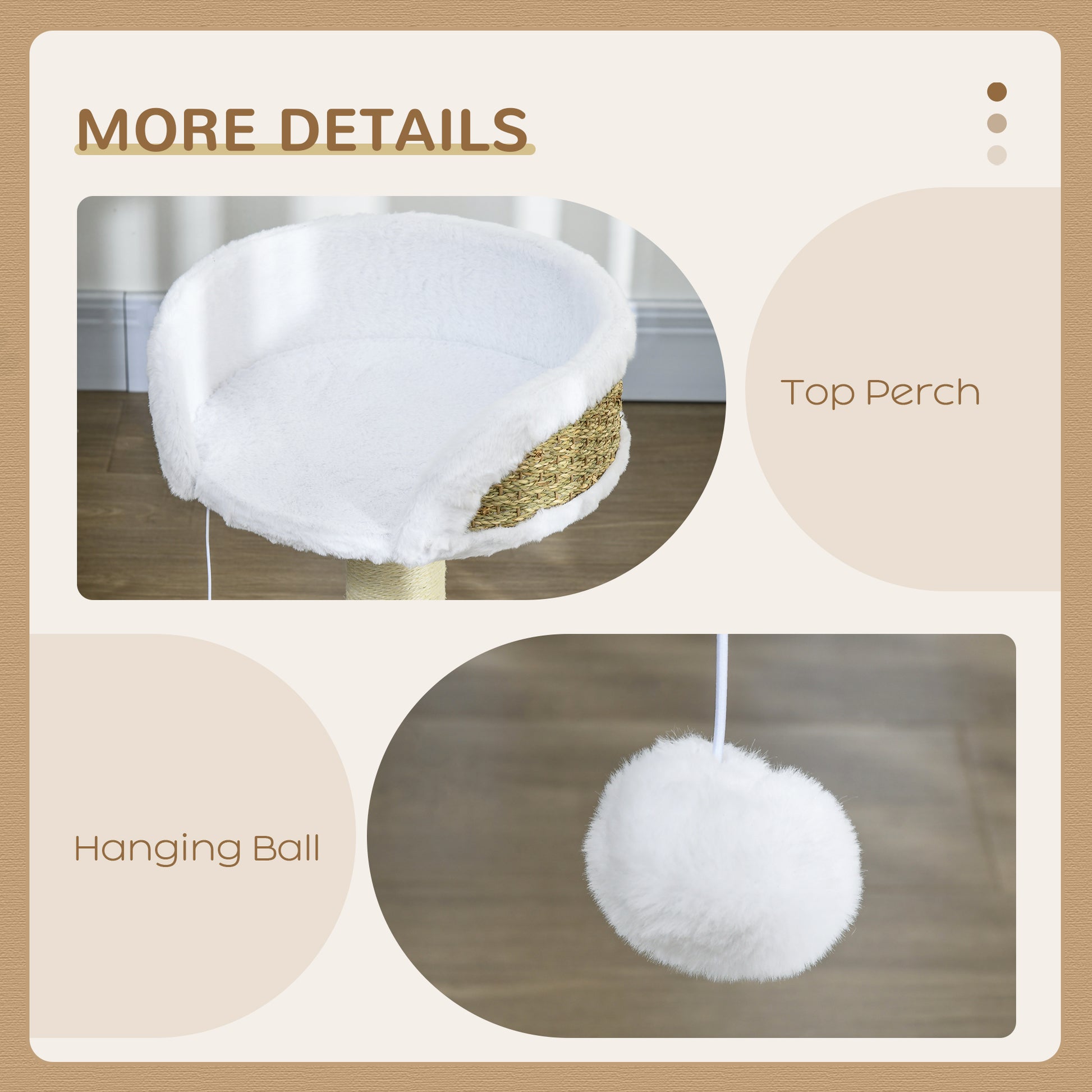 For cats who love to lounge, this modern cat tree will be a good choice. A simple 1-tier design, it features a large perch bed which is surrounded by a high wall for safety. There is soft plush inside the bed and also on the base so your pet is cosy and comfortable. Made from particle board, with sisal rope wrapped around the middle to give your cat somewhere to scratch their claws. It's finished with a hanging play ball which is ideal for when they're feeling a little mischievous.Specifications