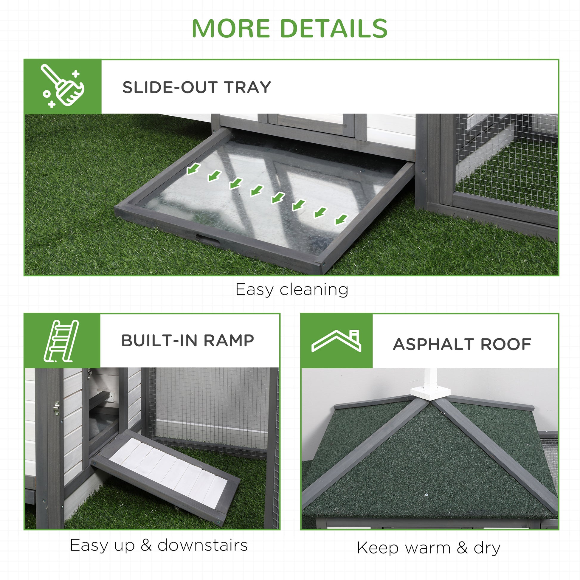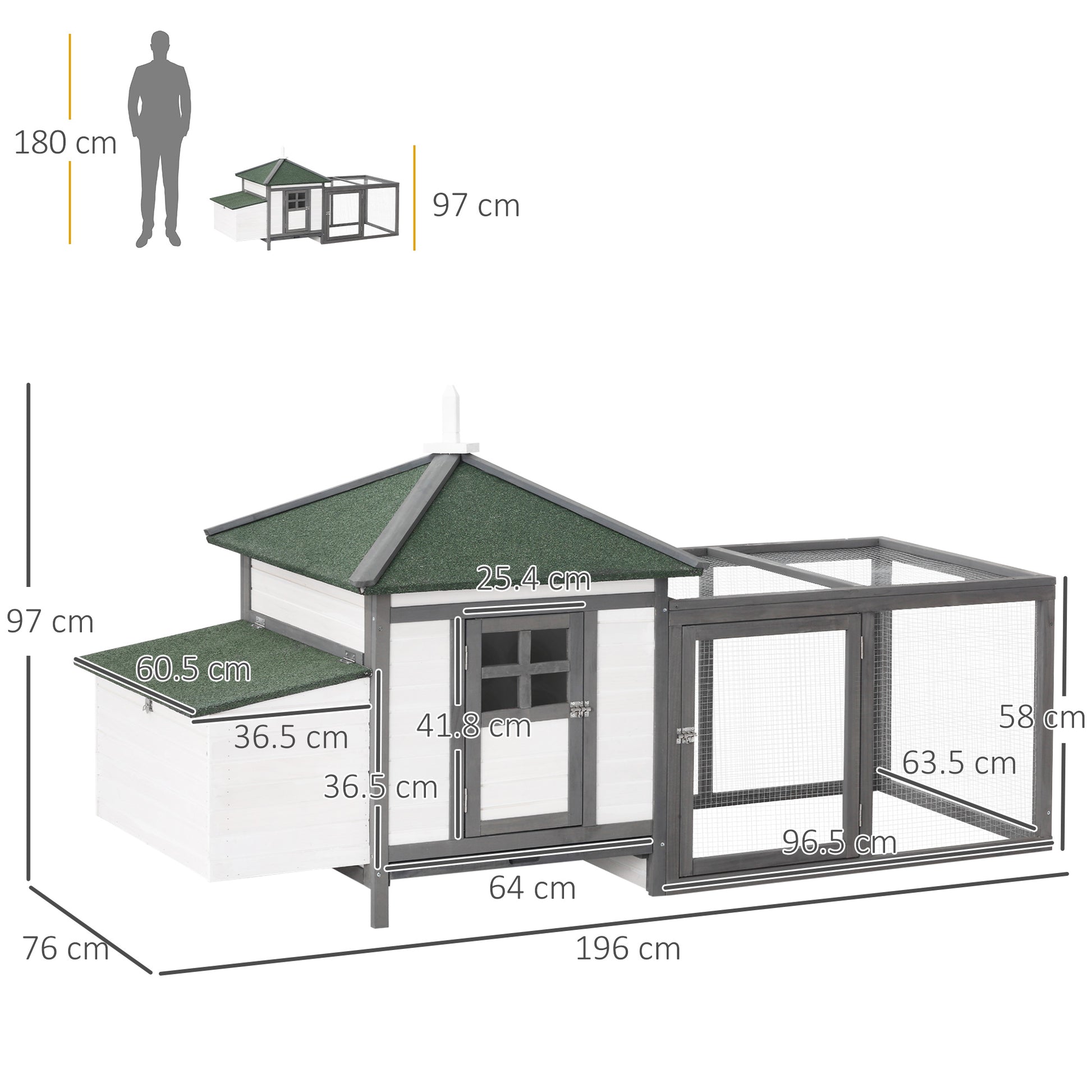 Give your chickens the freedom and comfort they crave plus the safety and security they need with PawHut Wooden Chicken Coop. Features coop, nesting box and outdoor run, giving your chicken room to roam, a place to roost and fresh outdoor air when they want. Start with the water-resistant roof in green asphalt composite material and work your way down to bottom pan which slides out easily to remove for cleaning. Security features include lockable sliding metal bolt doors and a premium galvanized wire run to protect animals from predators. Do more than just house your animals, provide them with the resources and opportunities!