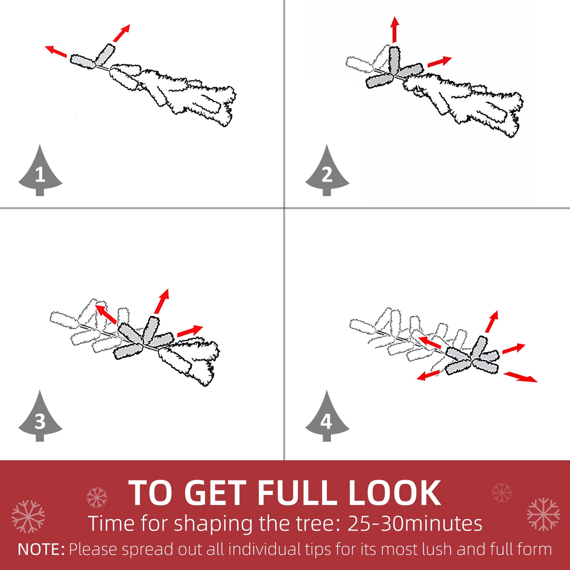 In order to get a full appearance, please spread out all individual tips to get the best possible look from the tree, suggest you to take 25-30 minutes to shape the tree.
