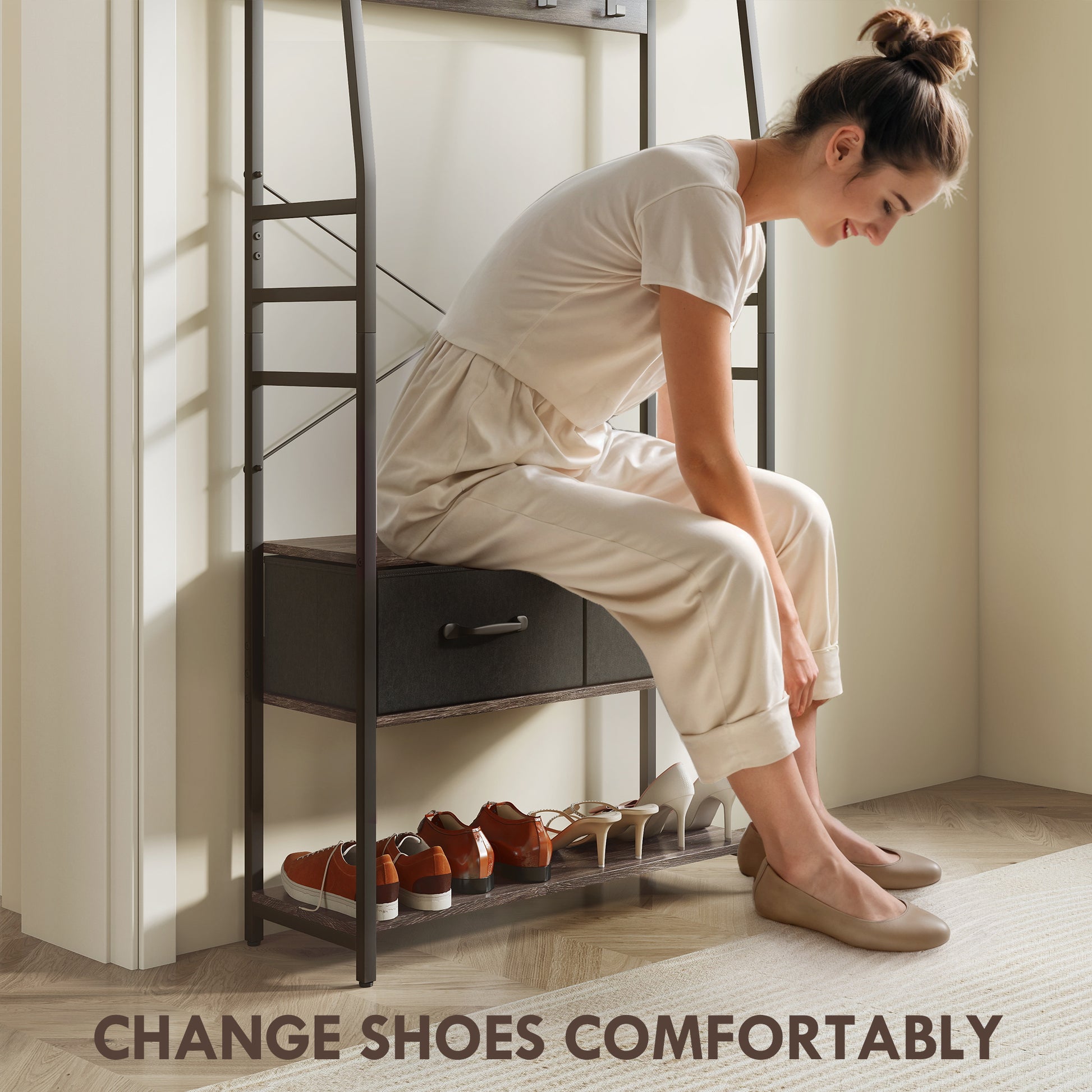 - 6-in-1 design: combines a hanging rail, a shoe bench, a shoe rack, a storage shelf, fabric drawers and coat hooks