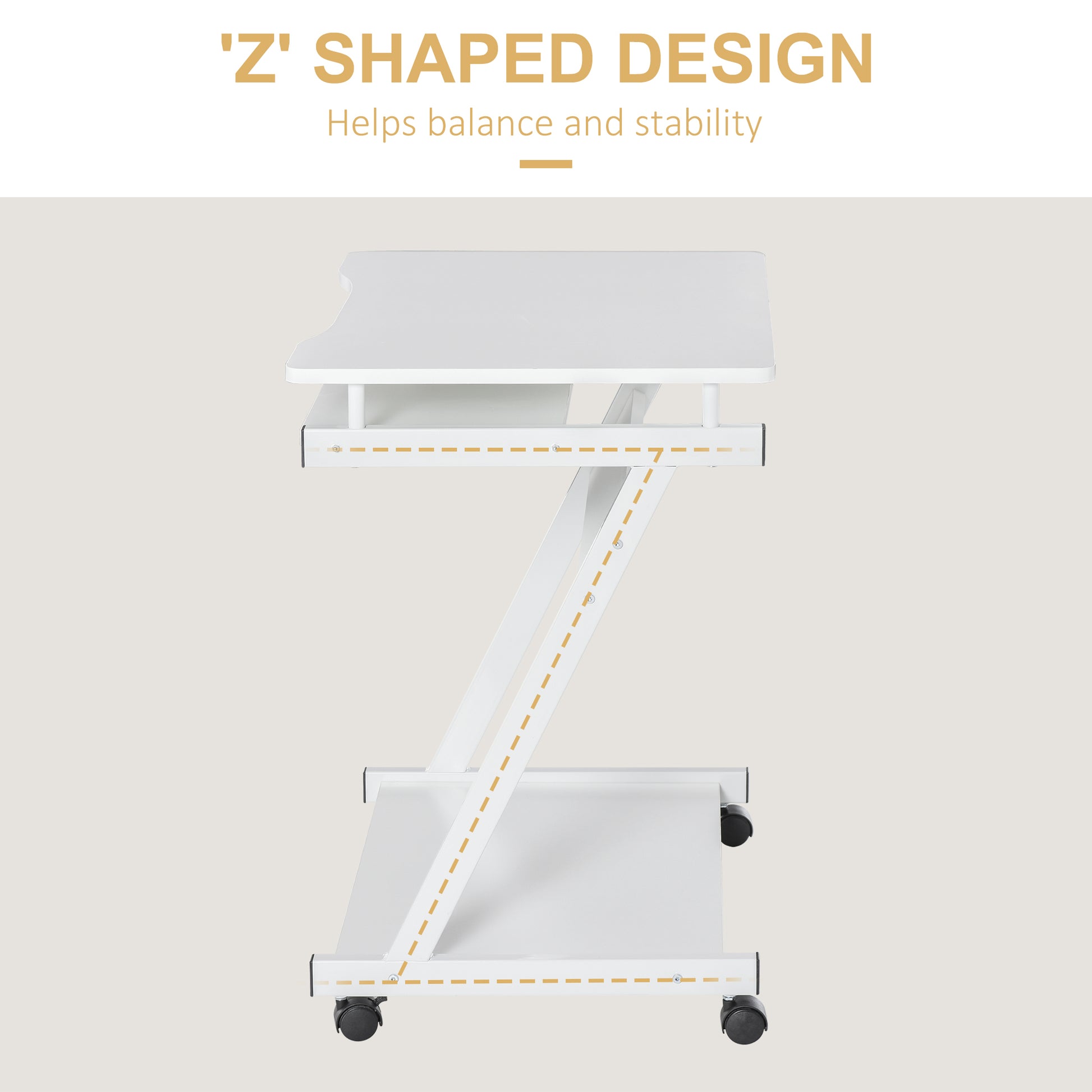 Keep your working times clean and clutter-free with this small desk for home office from HOMCOM. The frame is made of metal for a sturdy structure, crafted into a 'z' shape design which enables it to keep balanced and stable. It features an open tabletop, slide-out keyboard tray and bottom shelf, giving you plenty of room for working and storage. 4 locking wheels at the bottom, making this pc desk easy to move around and keep stationary. A modern piece perfect for all home and office spaces.