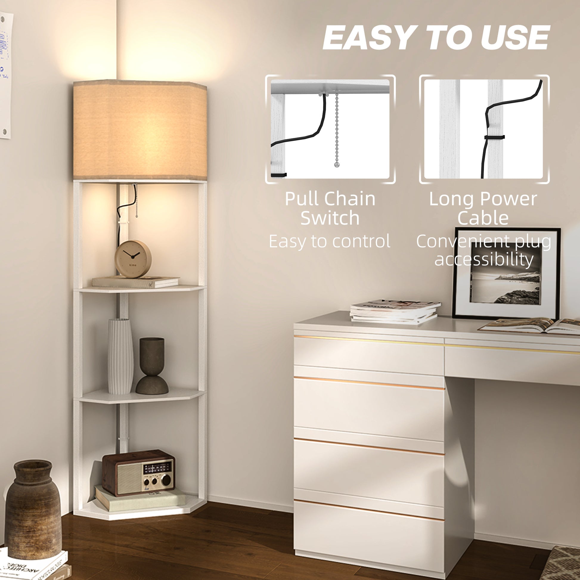 2-in-1 for the home: this shelf floor lamp, . Combines three shelves and top light - in a triangle design to neatly slot into corners. The top light is easy to operate - pull the chain to turn on/off. Its fabric shade omits a soft glow for a welcoming atmosphere. Three shelves give you plenty of storage room. Now you just need to decide where to put it...Specifications