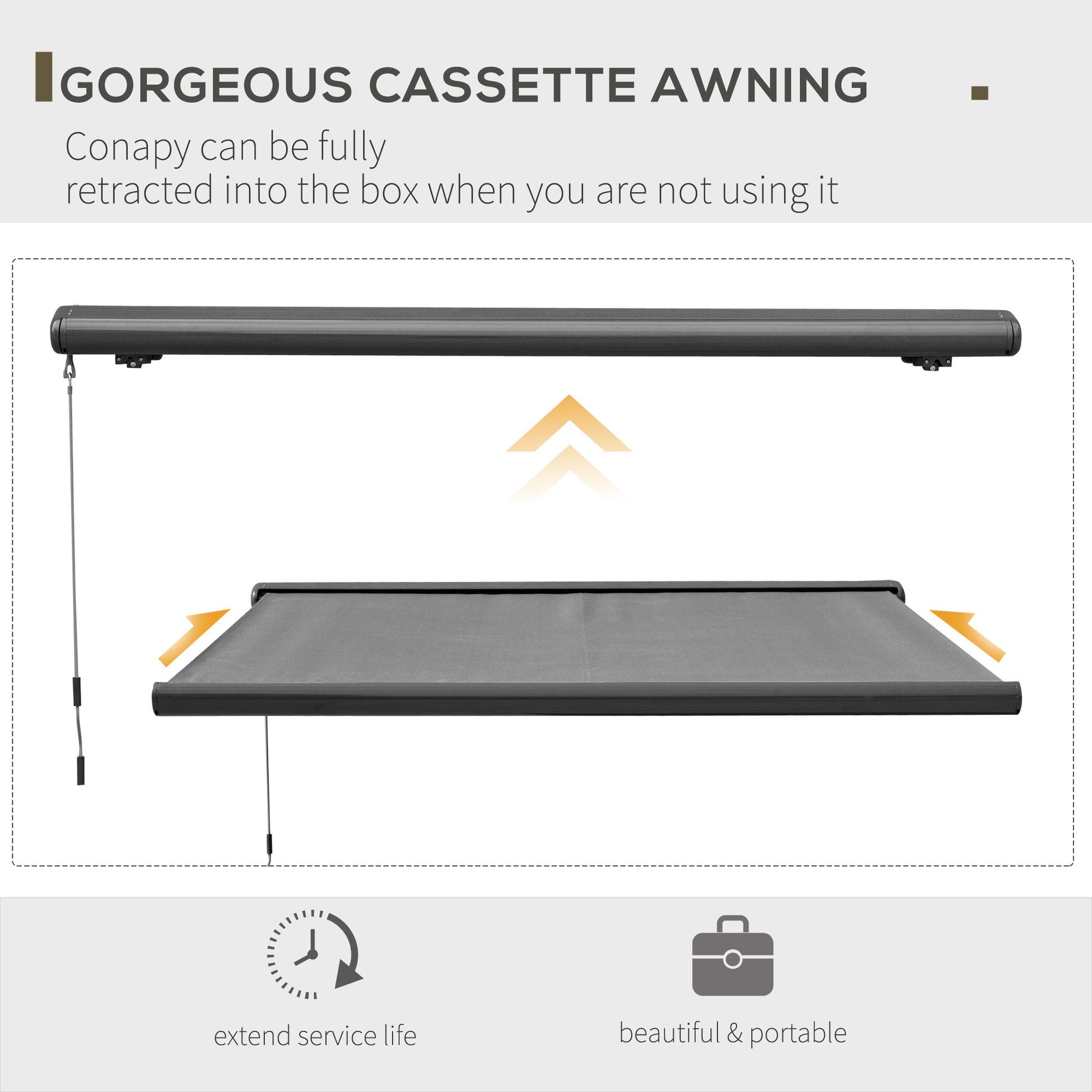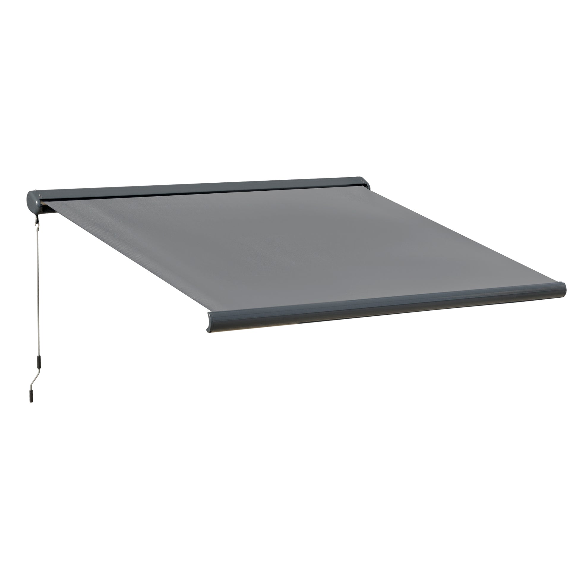 Create shade over your doorways and windows effortlessly with this electric awning from Outsunny. The robust aluminium and steel frame ensures durability for outdoor use. The thick 280g/m² canopy, coated with PVC, protects against UV rays and sun glare while retaining its vibrant colour through the seasons. A manual operation handle is included for convenience. This window awning can be securely mounted to cement walls and a remote control is included for easy operation.Specifications