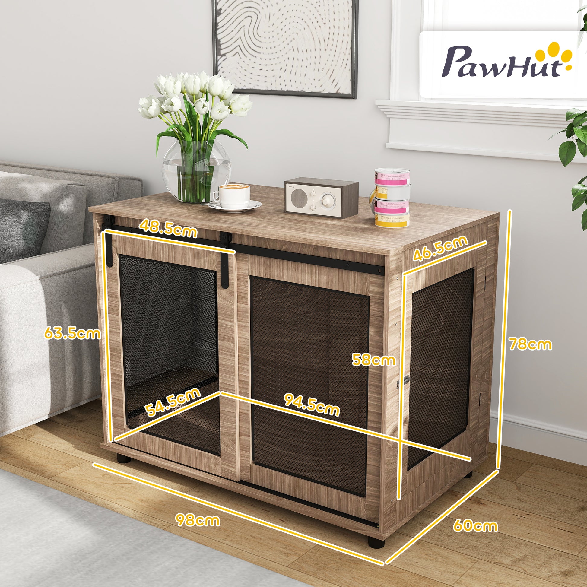 Discover the versatile Dog Crate Furniture, where functionality meets style! Use it as a cosy dog crate or a chic side table its particleboard and fine mesh grid design keep your furry friend from chewing. Boasting a dual-door setup, including a stylish barn door, this piece ensures comfort with a three-sided ventilation system and spacious interior for large dogs.Specifications