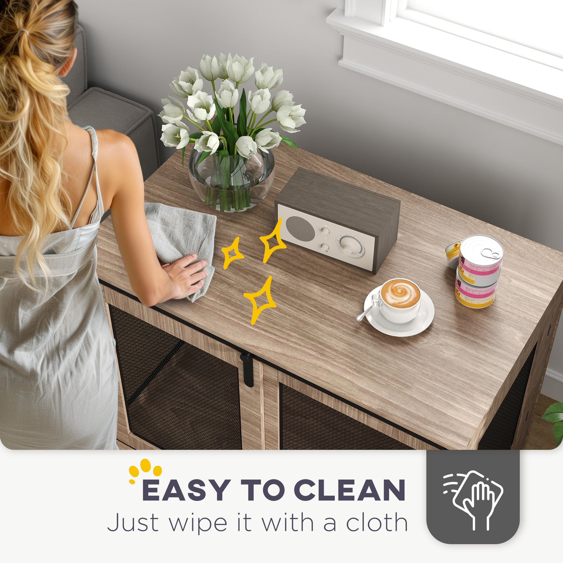 - Serves as a dog crate or stylish side table