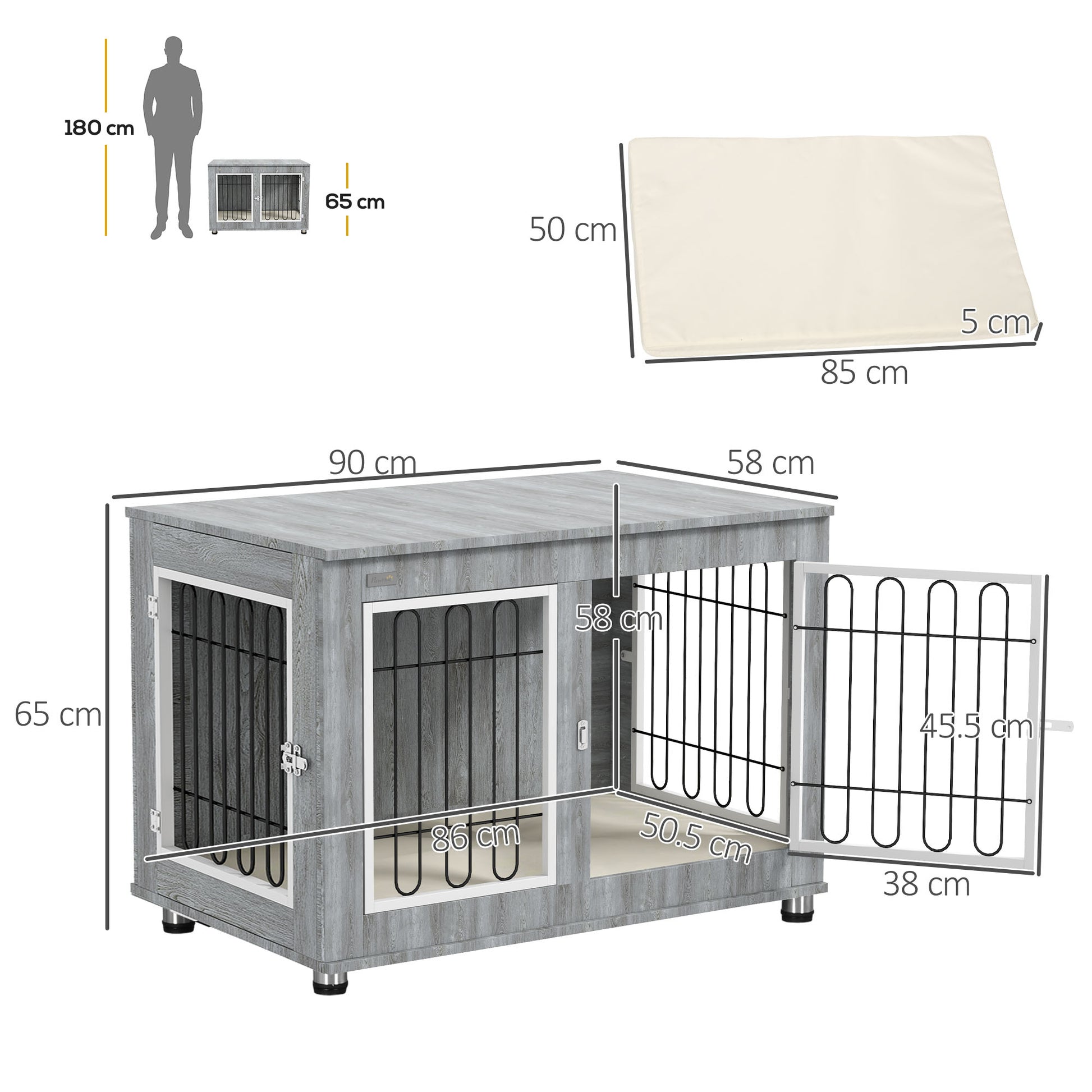 This dog cage, fused with a side table, is great for when you need pets to stay put. It's a spacious crate with a cushioned bottom for added comfort, whilst the steel wire keeps their space well ventilated - it also lets them look out, so they don't feel trapped. The latch keeps them securely inside, giving you peace of mind. Finished with a wide top, which can be used for displaying your favourite pieces, bringing style into your home. Something for you and large pets to enjoy.Specifications