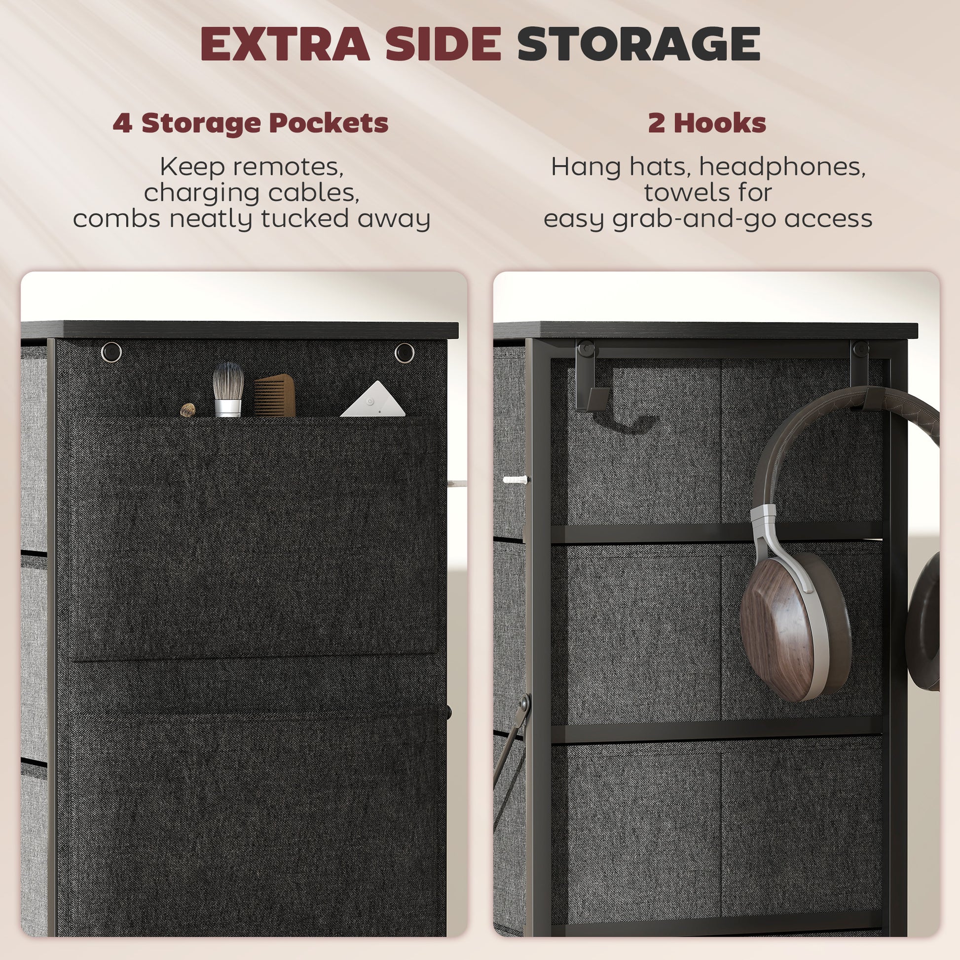 Easy, simple storage with this fabric chest of drawers. With three small and two large drawers, it's easy to sort everything from socks to pants. It also features four side pockets and two hooks to get smaller accessories altogether. A steel frame with X-bars keeps this bedroom dresser stable, finished with adjustable feet for balance - even on unsteady grounds.Specifications