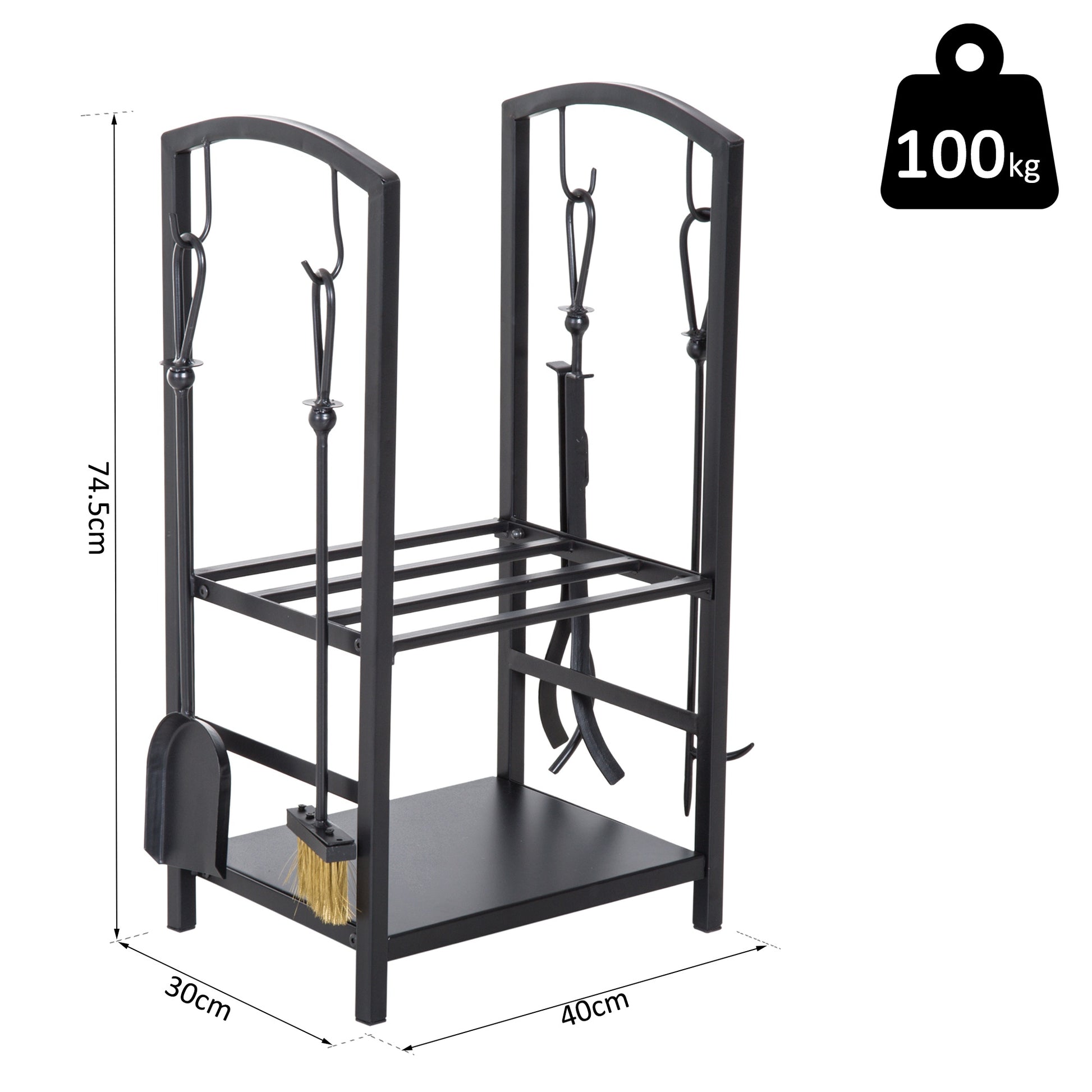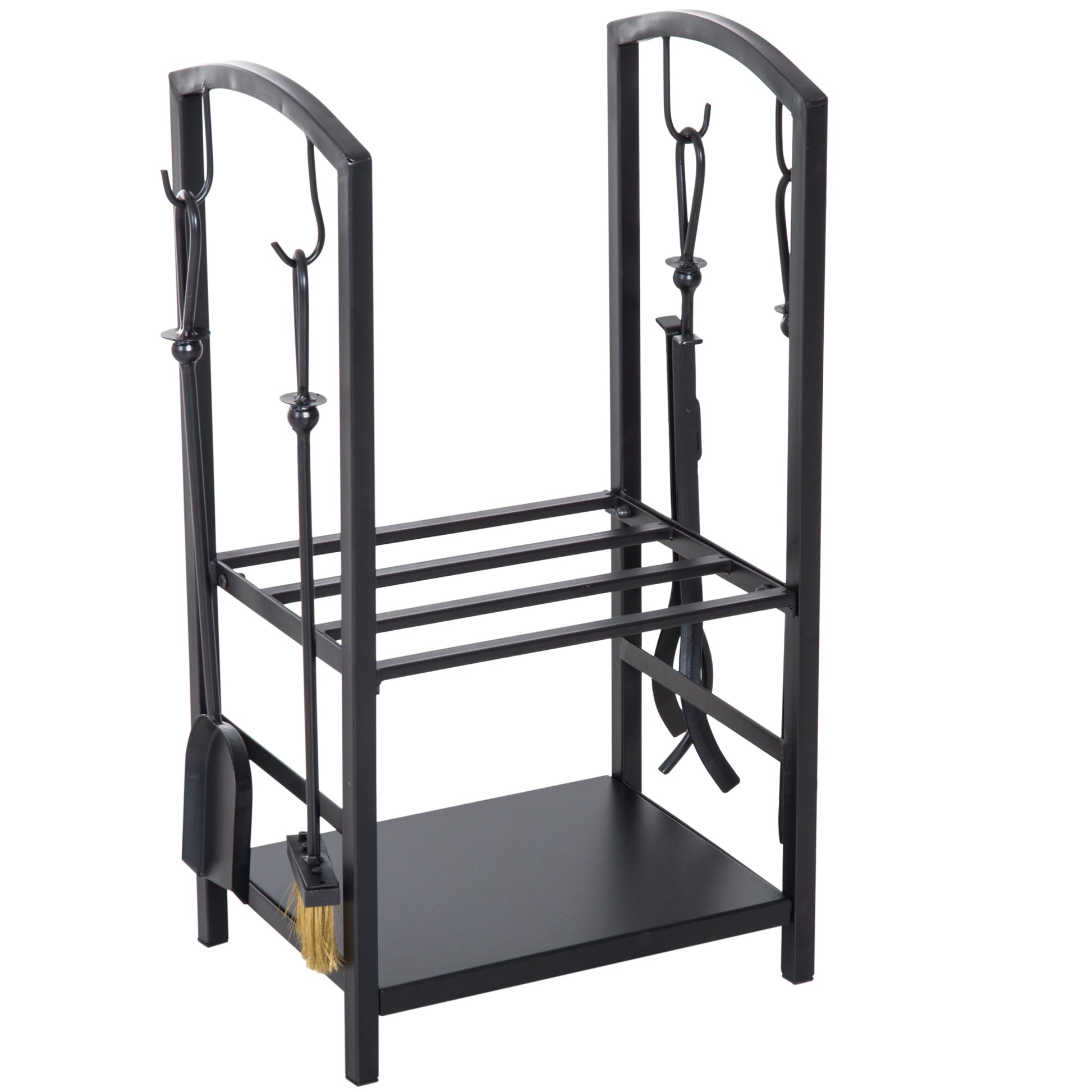 This steel firewood rack with accessories by Outsunny is a great item to have to keep your firewood secure and safe ready to use. Comes complete with 4 tools, a tong, a poker, a shovel and a brush, all the essential tools required for a fireplace. All tools can easily be placed on the hooks on the side of the unit within easy reach. Made from steel in a black finish It offers ideal way to organize and store your logs. Its elevated design keeps your firewood dry and makes your logs stay off the ground. Great for indoor or outdoor use from your living room fireplace to outdoor storage in the patio or garden, and a must have for any wood burning activity.