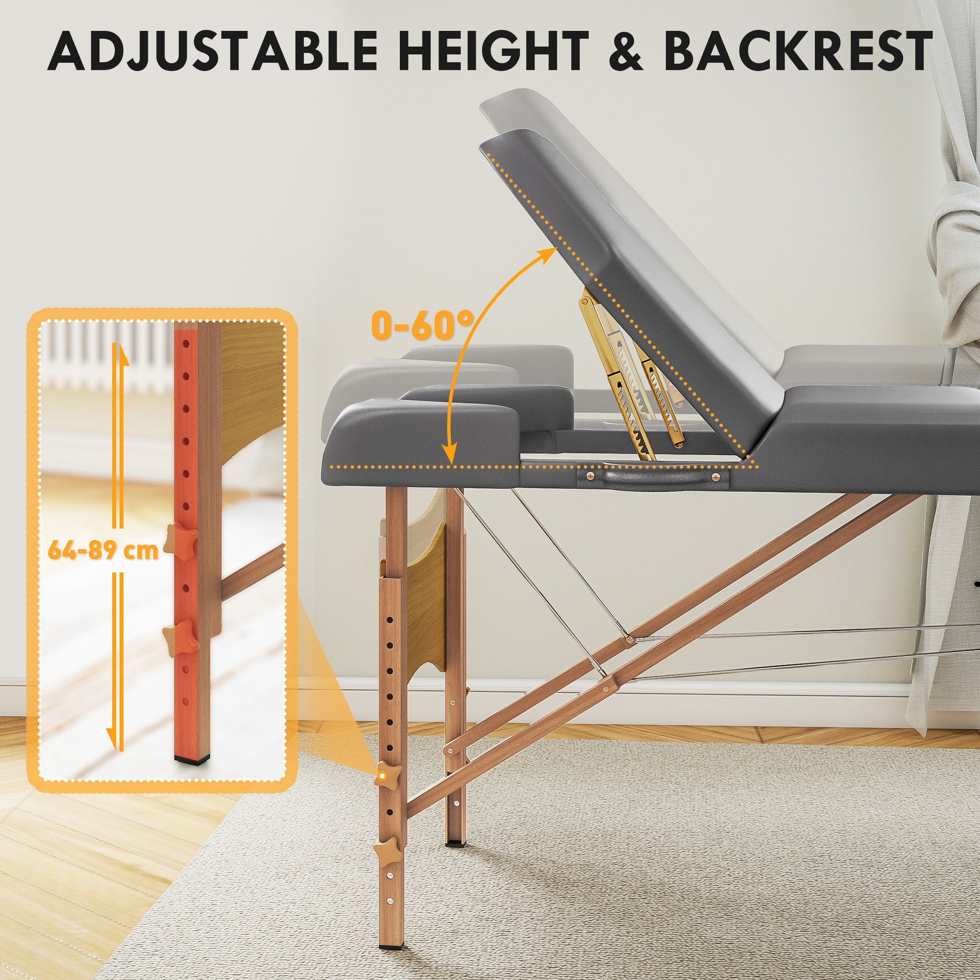 Foldable Massage Bed with Beech Wood Legs Face Cradle Armrests Grey