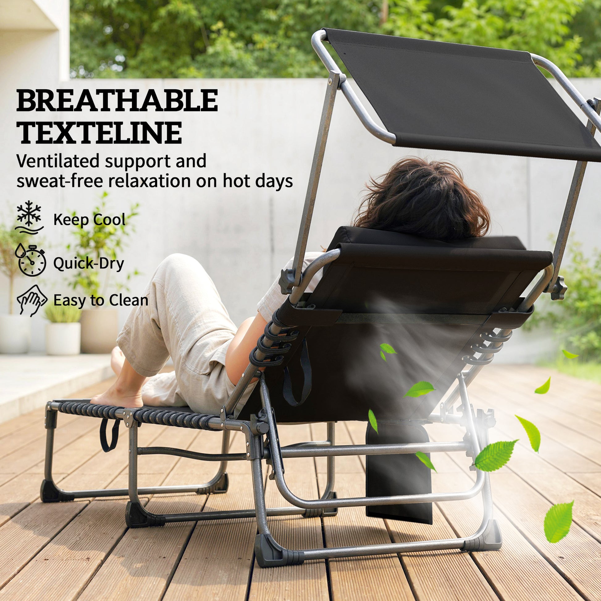 Sun lounger bed sessions can be a constant battle with the elements—too hot on sticky chair, glare in your eyes and an uncomfortable neck. This struggle for simple relaxation often ends in frustration. foldable sun lounger with cushion transforms your outdoors into a personal oasis. Find your preferred angle among five positions. Stay breathable and cool on the texteline seat or comfortable with soft cushion. Block the harsh sunlight with the adjustable canopy for blissful comfort.Specifications