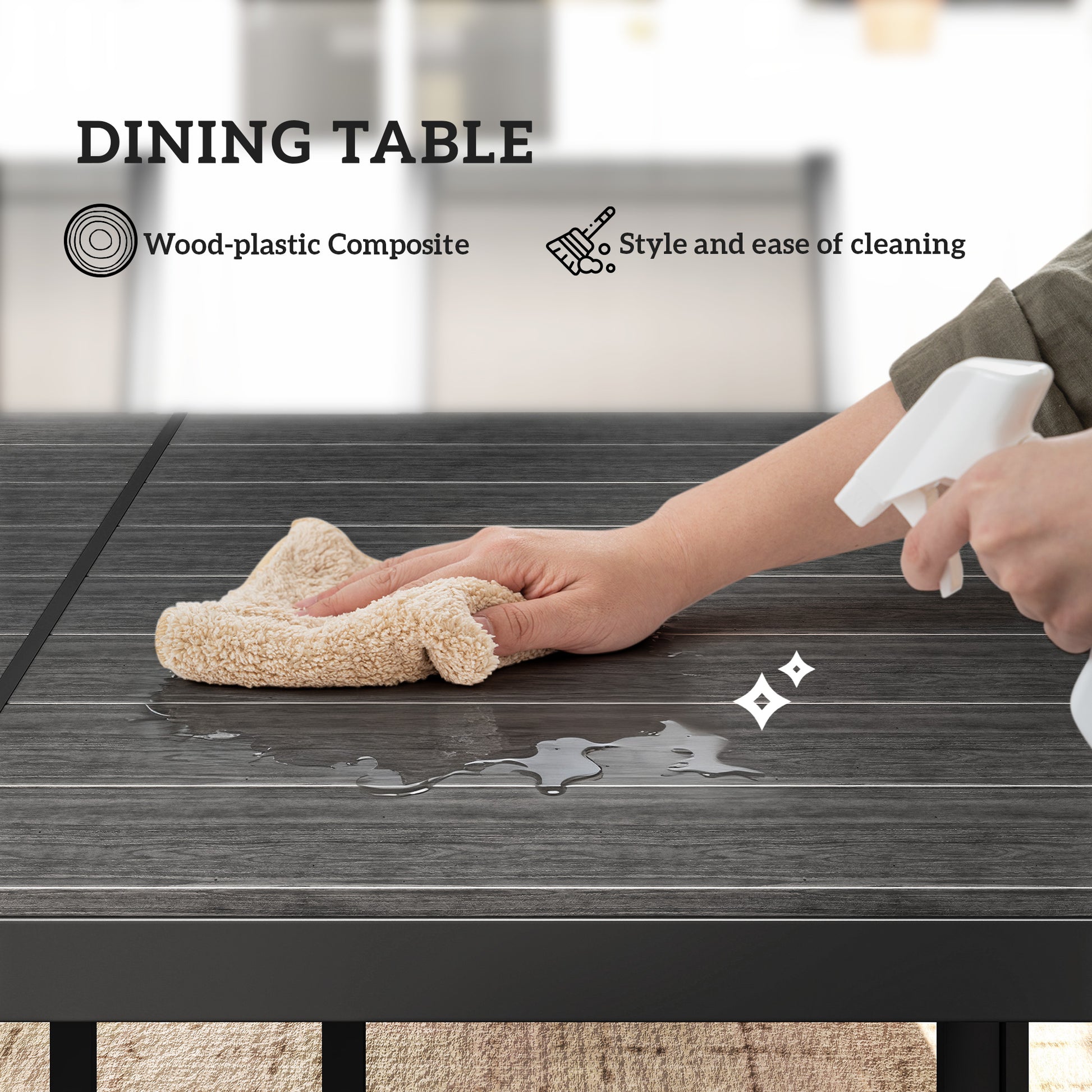Whether it's for breakfast, brunch or dinner, this seven-piece garden dining set brings everyone together. Six stackable chairs to sit with your favourite people, with the large table giving plenty of dining room. Made from plastic wood composite board, the tabletop is strong and low-maintenance. Our garden table and chairs are suitable for outdoor use: the teak-effect design is an excellent addition to outdoor spaces.Specifications