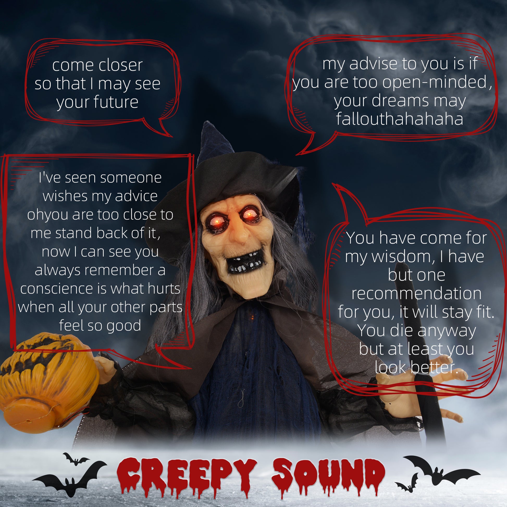 Unleash spine-chilling thrills with the Animated Halloween Prop, featuring a witch with a broomstick whose arms contort as you desire. Triggered by touch or piercing screams, this fiendish figure waves its hands, boasts eerie red glowing eyes, colourful glowing pumpkin and creepy talking, making it a standout Halloween outdoor decoration for any haunted house or outdoor Halloween decor.Specifications