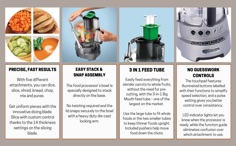Bring commercial quality performance to your kitchen countertop with the Hamilton Beach Professional 14 Cup Dicing Food Processor. Designed for the accomplished home cook, this food processor includes everything you need to quickly dice, slice, shred, knead, chop, mix and puree.