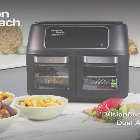 Experience quicker, healthier, and simpler family cooking with the VisionCook 11L Digital Dual Air Fryer Oven by Hamilton Beach. With two large viewing windows, this appliance lets you monitor meal progress without opening the drawer, saving time and energy. Featuring two 5.5L drawers, you can cook multiple items simultaneously, each with different times and temperatures. The sync finish function simplifies cooking by ensuring both drawers finish cooking at the same time.