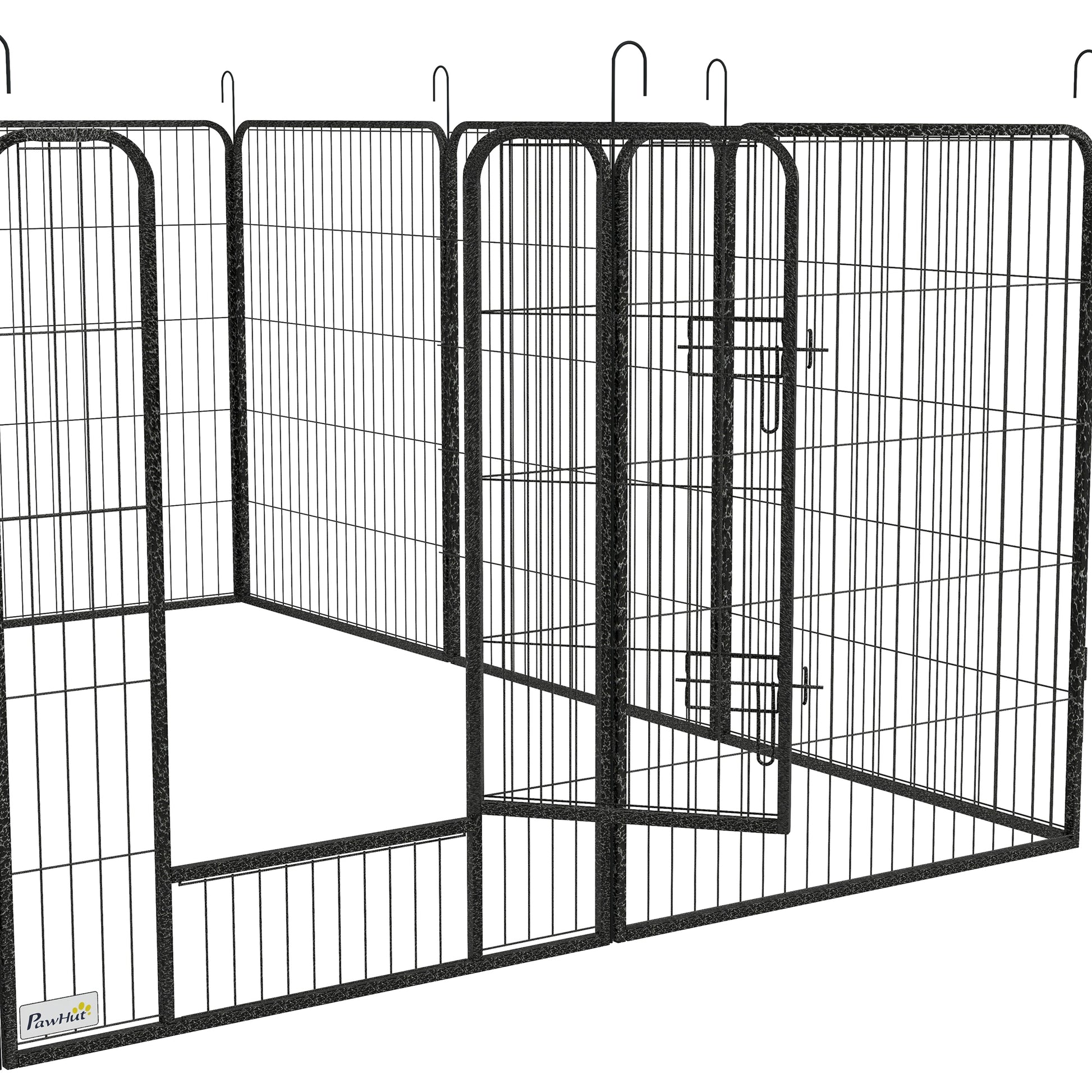 - Steel frame: A durable pet pen, suitable for indoor and outdoor use. Includes step-through doors for easy access. The locks keep pets securely inside when needed.