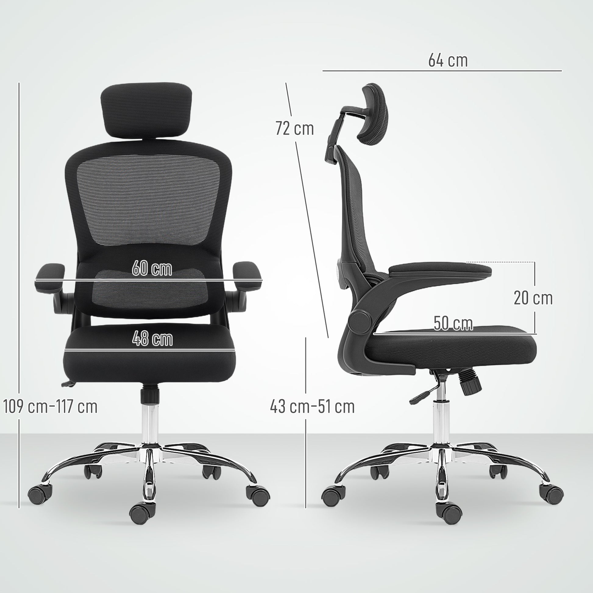 All day support as you work, with this office chair. A padded seat for comfort, with mesh fabric all over: this helps keep the chair and you as cool as possible. Set the seat between 43–51 cm to work at the level you want, with an adjustable headrest for head and neck support. It has lumbar support for your lower back. When done, all you have to do flip the armrests up so it fits underneath your desk.Specifications