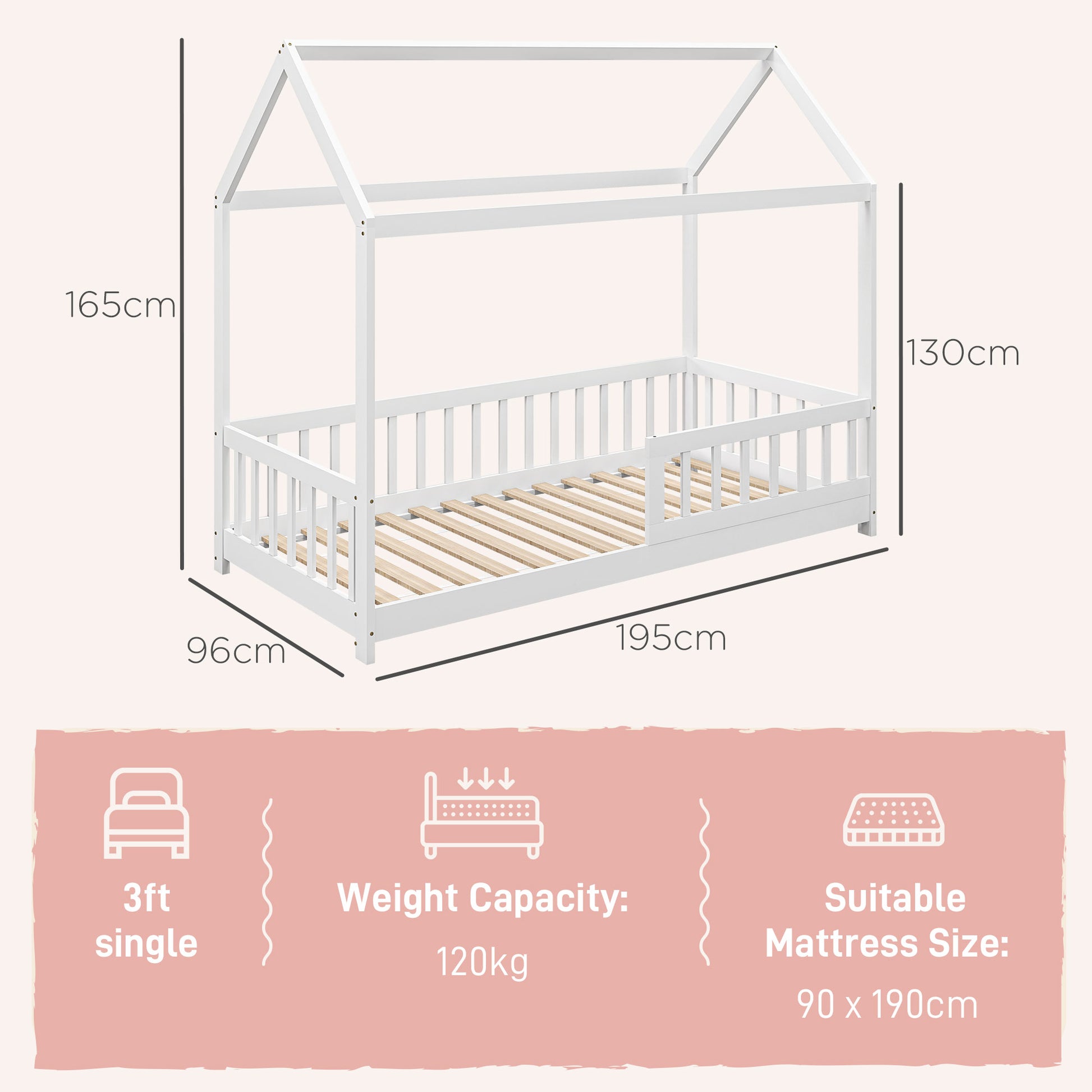 House-Shaped Kids Bed Frame with Safety Fence for Boys Girls, White